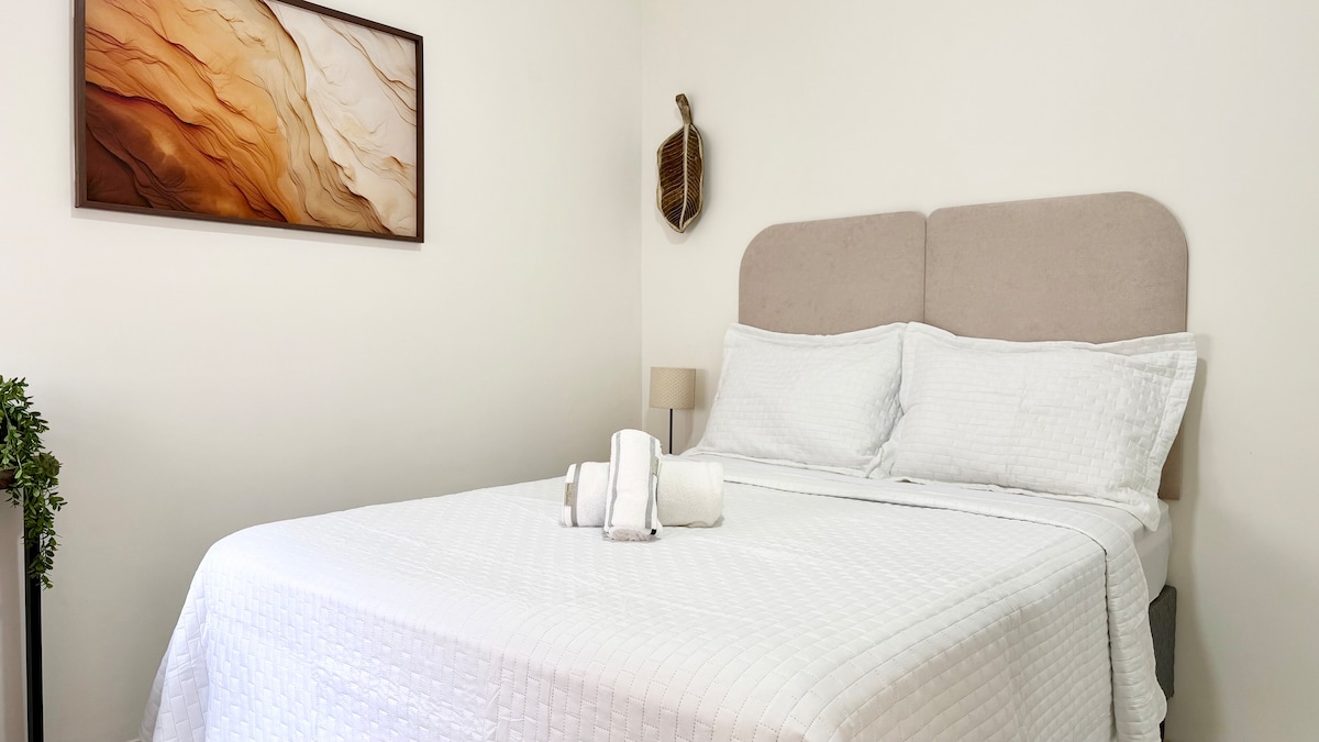 Komportableng double bedroom na may modernong palamuti, aparador , bedside table drawer, ninchos, rack ng sapatos, key drawer at hanger . May desk kung saan puwedeng magtrabaho ang bisita sa kanyang computer, bintana na may kurtina, at hanger ng handbag. Air conditioning o bentilador , at minibar. Medyo maluwag ang ap, malapit ang tanawin ng dagat sa mga tindahan, restawran, meryenda , gym, parmasya, at ilang metro lang ang layo mula sa beach para lumangoy at mag - hike.