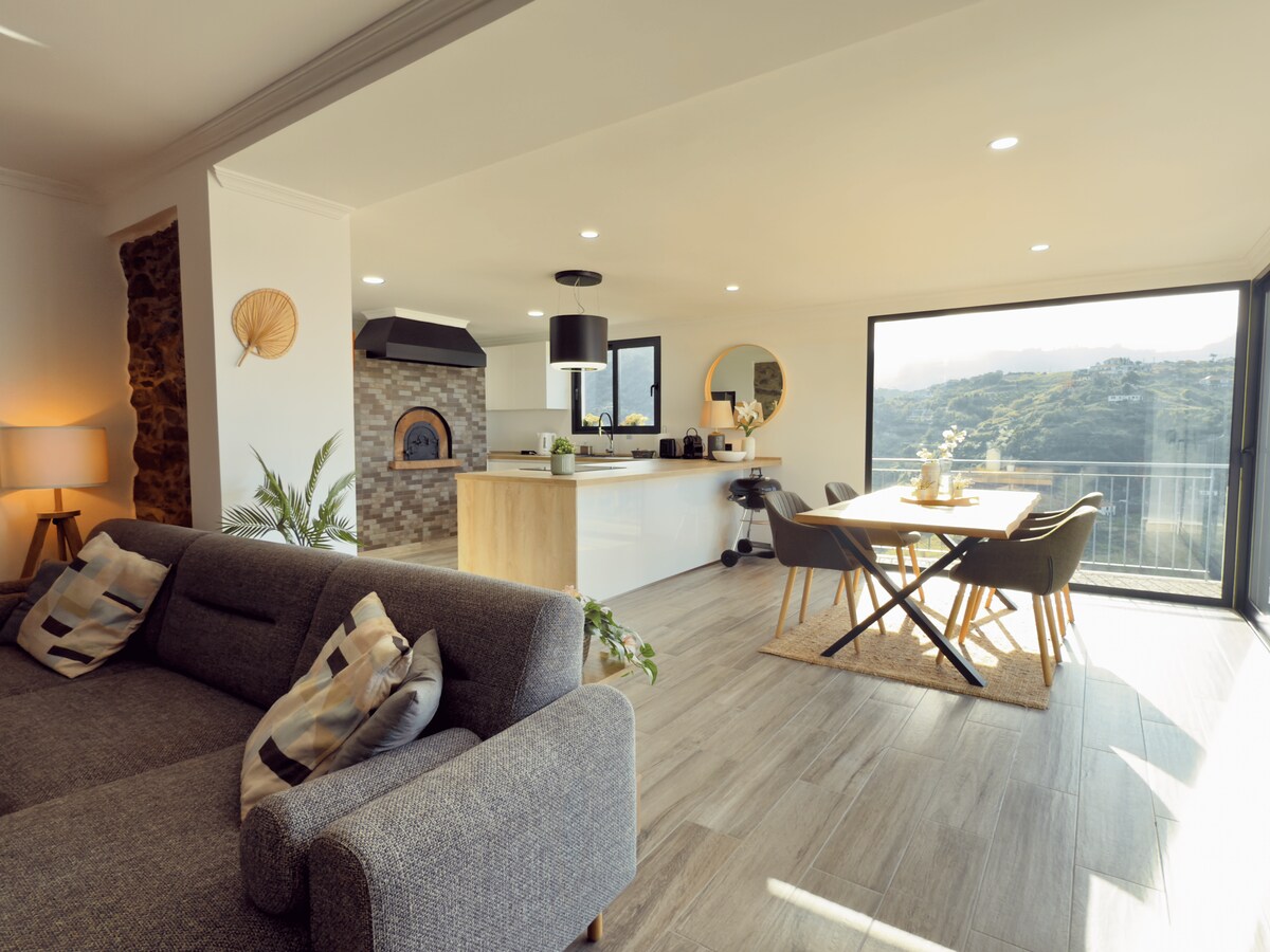 May malawak na tanawin ng karagatan, kabundukan, at Eagle Rock ang bahay sa gilid ng burol sa ibabaw ng Porto da Cruz. Sa 140 m², may espasyo ito para sa apat na bisita, dalawang kuwarto, dalawang banyo, maliwanag na sala na may mga panoramic na bintana, at modernong kusina na may tradisyonal na oven. May tatlong terrace sa iba't ibang palapag na may magandang tanawin at puwedeng gamitin bilang outdoor space. Pinagsasama ng interior ang modernong disenyo at mga detalye ng Madeira. Nagsisimula ang mga hiking trail sa bahay, at malapit ang mga tindahan at beach.