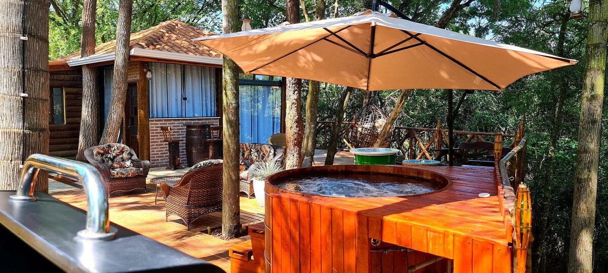 Masiyahan sa isang romantikong bakasyunan sa aming cabin sa deck, na napapalibutan ng kalikasan. Magrelaks sa ofurô habang tinatangkilik ang tanawin ng kagubatan. Kumpleto ang kusina, komportableng kuwarto at portable na barbecue grill para sa mga espesyal na sandali bilang mag - asawa. O masiyahan sa katahimikan sa tabi ng pool, tikman ang isang romantikong barbecue at tamasahin ang privacy ng kapaligiran. Gamit ang kumpletong kusina, sound box at tahimik na kapaligiran, ito ang perpektong setting para sa isang bakasyon para sa dalawa.