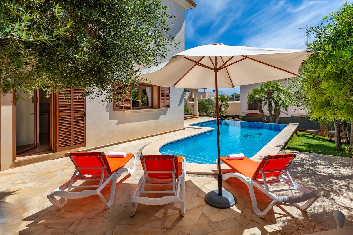 Disfruta de unas vacaciones inolvidables en esta villa luminosa de estilo moderno , perfecta para familias y grupo de amigos. Ubicada en una zona tranquila , ofrece privacidad y confort. Relajate en la terraza , prepara deliciosas comidas en la BBQ y disfruta del ambiente Mediterraneo con su hermoso jardin y piscina. Espacios amplios y confortables. Reserva ya! Y vive el sol de Mallorca , disfrutando de tus merecidas vacaciones.