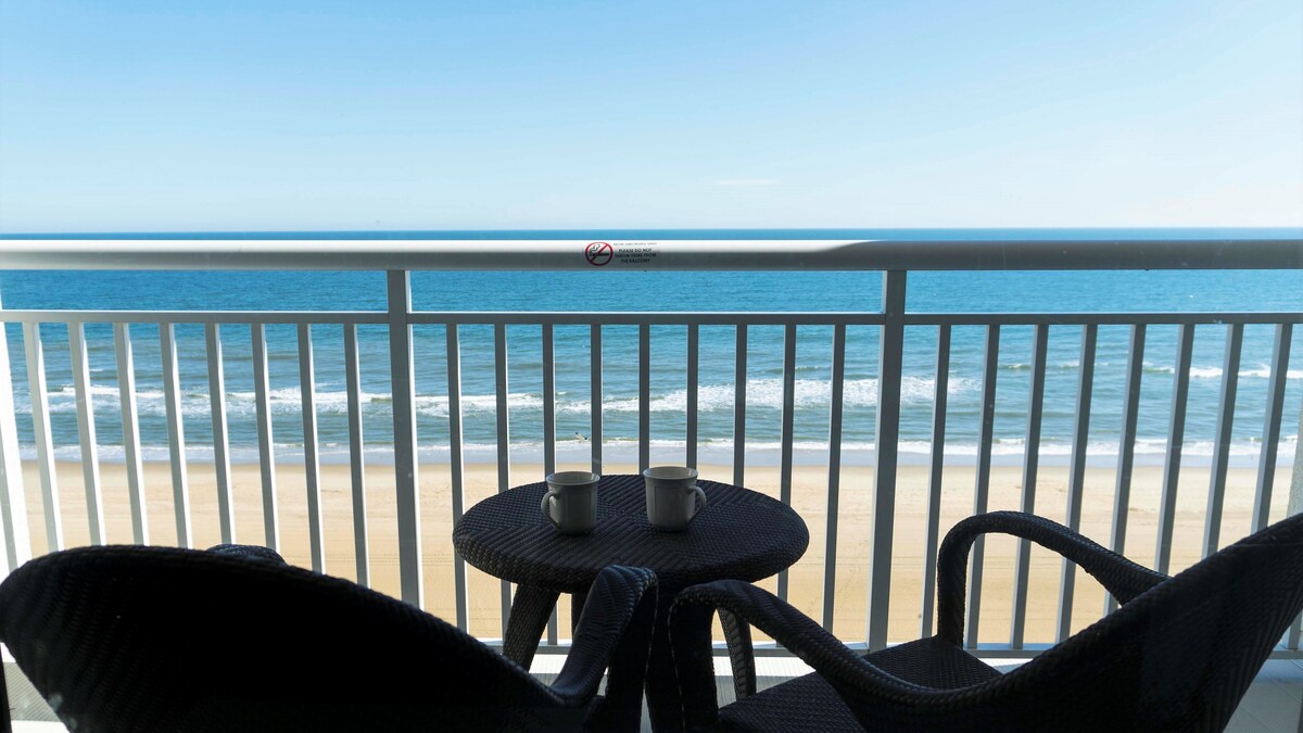 1Br 1BA vacation unit na may double - wide jetted tub at double oceanfront balcony. Nagtatampok ang unit ng kusina, silid - kainan, sala na may sofa sa pagtulog, at silid - tulugan na may king bed. Kaagad na nasa tabing - dagat ang lahat ng kuwarto sa yunit na ito. Libreng paggamit ng bisikleta. Eksklusibo sa listing na ito: Puwede akong magbigay ng pagpasok sa aquarium para sa hanggang apat na taong may paunang kasunduan. Ang pag - check in ng bisita ay dapat na 21 taong gulang o mag - order gamit ang ID at bank card para sa isang hold laban sa mga incidental. Walang party, walang alagang hayop, walang paninigarilyo.