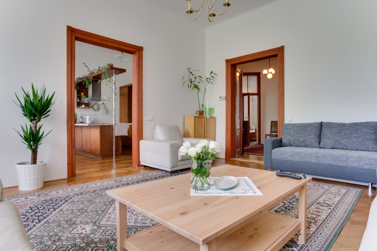 Ito ang pangarap mong apartment sa Prague! ✨ Tingnan ang aming mga kamangha - manghang review! Nag - aalok kami ng magandang 2 - bedroom flat na may maluwang na sala at kusina (120 m²) sa makasaysayang gusali na may elevator. Kamakailang na - renovate, eleganteng kagamitan, ganap na naka - air condition, at may kumpletong kagamitan para sa iyong perpektong pamamalagi. Matatagpuan mismo sa gitna ng Prague, may maikling lakad lang mula sa Charles Bridge, Dancing House, Petrin Hill, Prague Castle, at 5 - star na Novy Smichov shopping center. Magugustuhan mo ang lugar na ito!