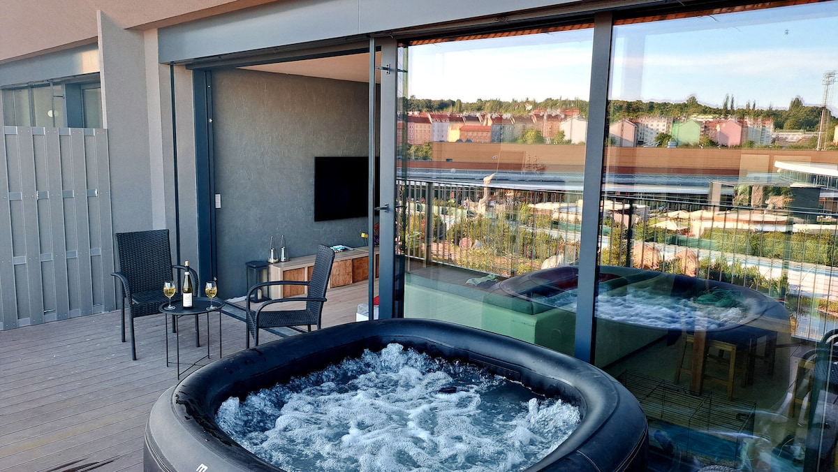 Stay in the heart of Prague in this modern 3-bedroom apartment, perfect for up to 9 guests. Relax in the private hot tub, enjoy gaming on the PS5, or stream your favorite shows with Netflix, HBO Max and Disney+. With 2 bathrooms, a spacious living area, fully equipped kitchen, and large private terrace, it's ideal for unwinding after exploring the city. Steps away from iconic landmarks, restaurants, and shops, this apartment combines luxury, comfort, and an unbeatable location.