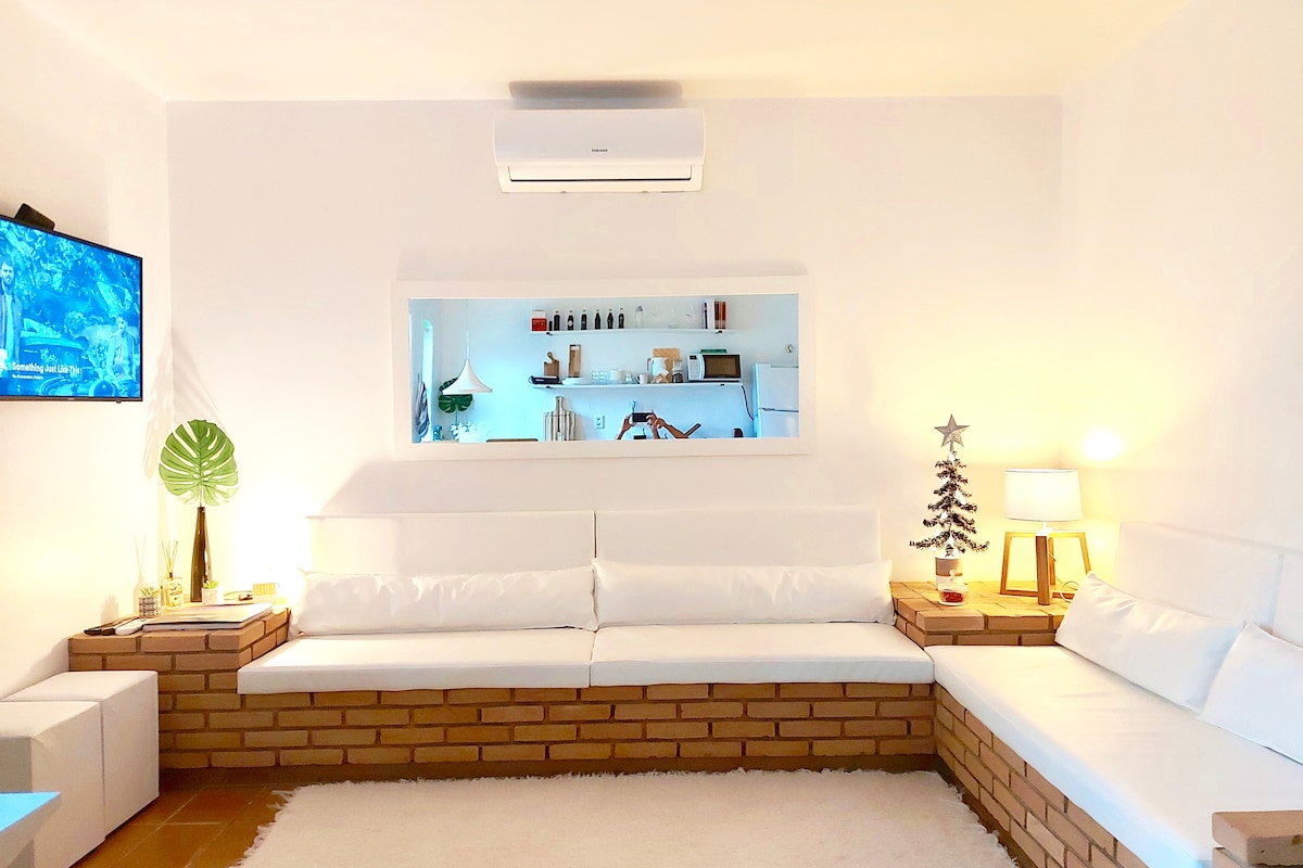 Ang kumpletong apartment, ay tumatanggap ng hanggang 3 bisita (ang halaga ay nag - iiba depende sa bilang ng mga tao), 1 silid - tulugan na may queen bed at 1 single bed, sala na may Smart TV, pribadong banyo at kusina na kumpleto sa kagamitan. - Kasama ang mga linen para sa higaan at paliguan (walang pagbabago); - Air conditioning sa kuwarto; - Ceiling fan sa kuwarto; - Smart TV; - Wifi; -1 parking space; - Sariling pag - check in gamit ang elektronikong lock; - 200 metro mula sa beach ng Lázaro; * Hindi kami tumatanggap ng alagang hayop.