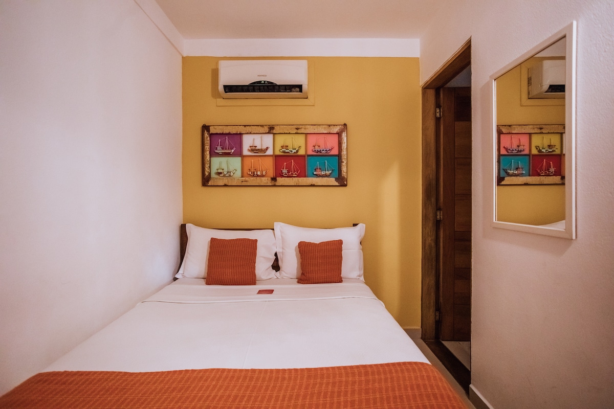 O Quarto Econômico, com 12 m², é compacto e acolhedor. Equipado com uma cama de casal, ar-condicionado, frigobar, Wi-Fi, ventilador de teto, enxoval completo e banheiro privativo com secador de cabelo. Acomoda até 2 pessoas.