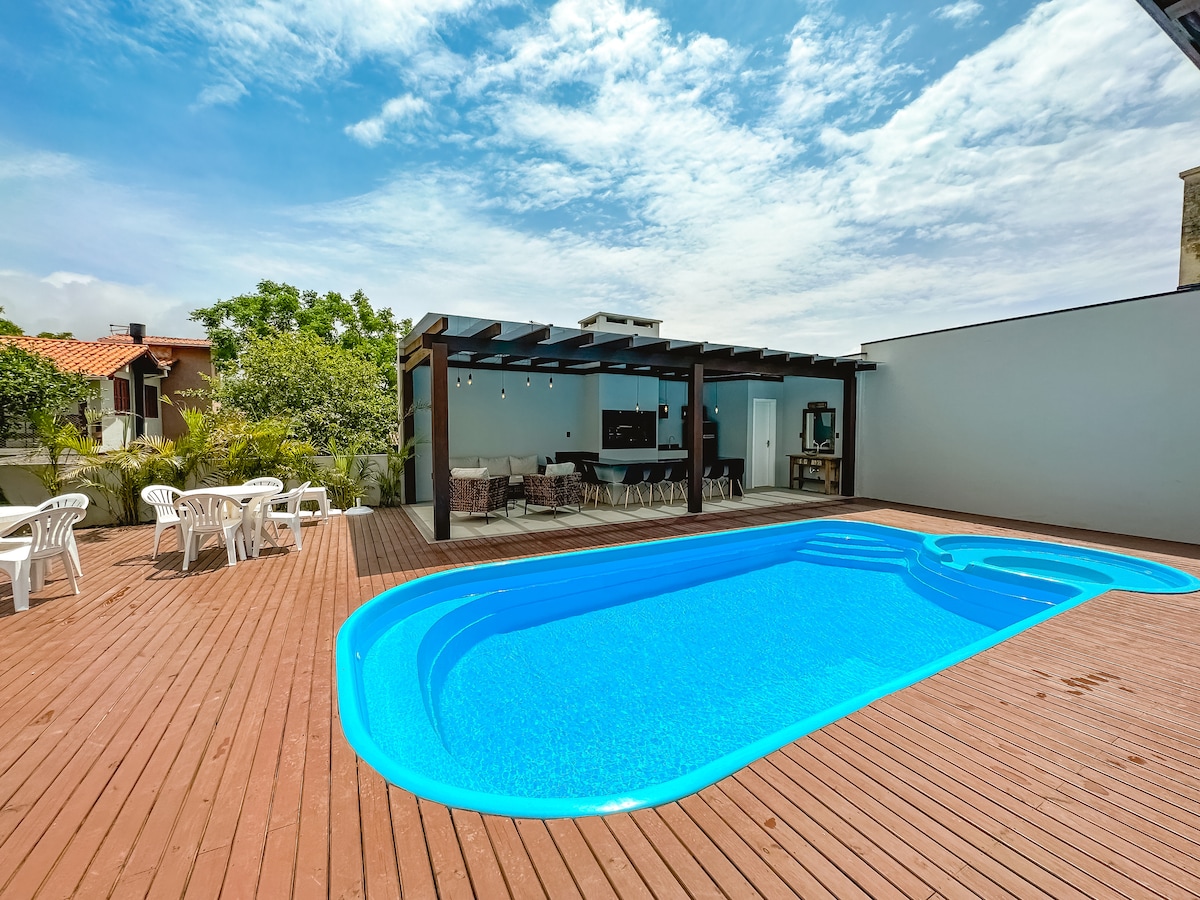 Idinisenyo ang aming tuluyan para sa aming mga bisita. Mayroon kaming espasyo na may 1500m², ligtas na lugar, kumpleto at kumpleto sa gamit na bahay, pool table, heated pool, hot tub area, access sa pribadong lagoon, paddle board, kayak, atbp. Pribilehiyo ang aming lokasyon para sa mga likas na kagandahan, matatagpuan kami mga 2km mula sa Praia do Rosa, ngunit bukod pa sa magandang beach na ito, may iba pang magagandang beach din sa rehiyon, tulad ng Ouvidor Beach, Barra de Ibiraquera Beach, Praia do Luz, atbp…