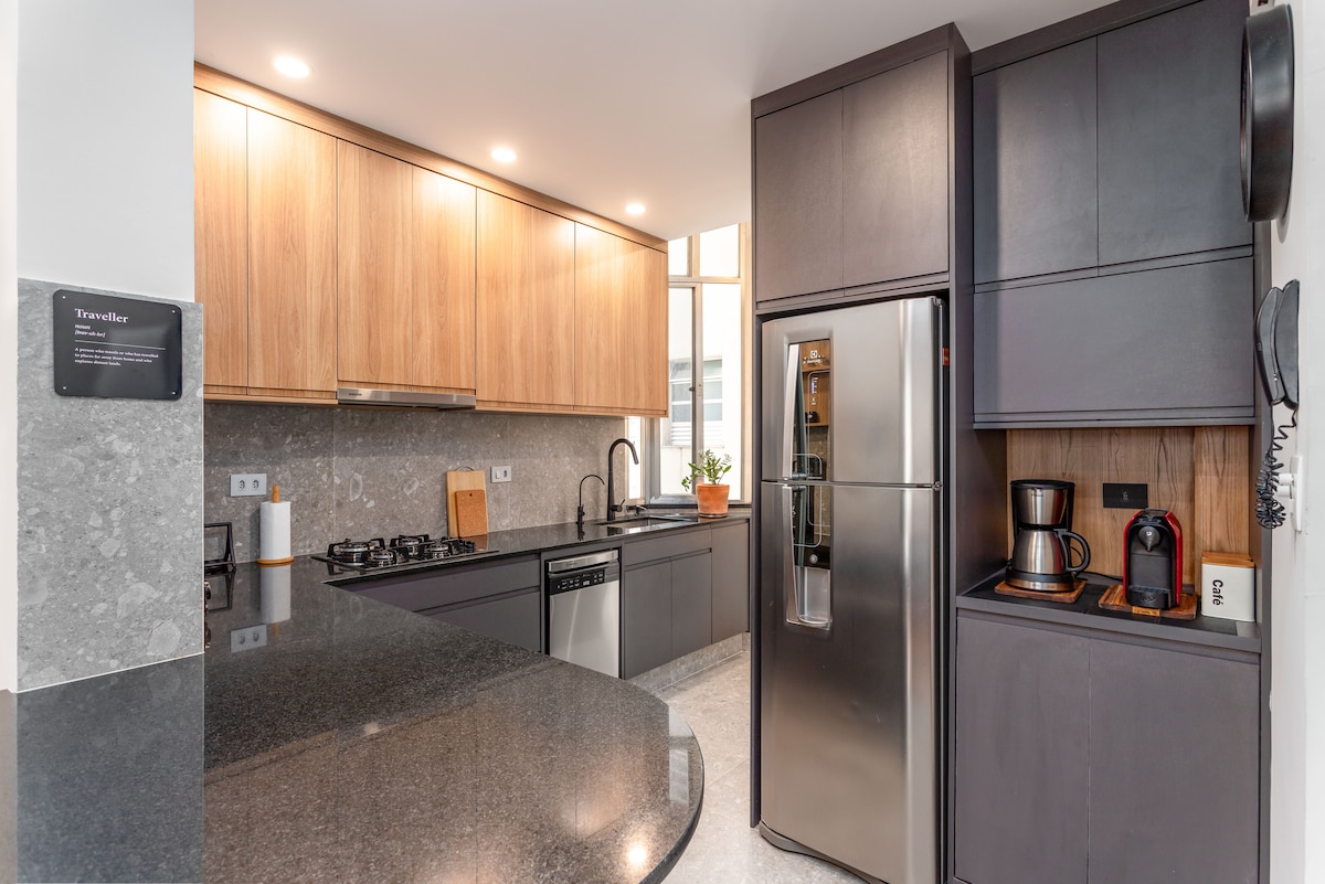 Copacabana Beach condo na may natatanging modernong estilo. Maluwang na 2 higaan 2 paliguan na ganap na na - renovate, American style na kusina. Hatiin ang A/C sa mga silid - tulugan. Kusina na may mga hindi kinakalawang na asero na kasangkapan, coffee maker, microwave, dishwasher, oven, cooktop at washing machine. 2 bloke mula sa beach. Malapit sa istasyon ng metro, mga supermarket, mga bar, pamimili at mga restawran. Sa gitna ng Copacabana Posto 3. Malapit sa mga kapitbahayan sa timog zone: Lagoa, Ipanema, Leblon, Botafogo, Flamengo at Urca. Napakalapit sa ospital ng Copa D'or.