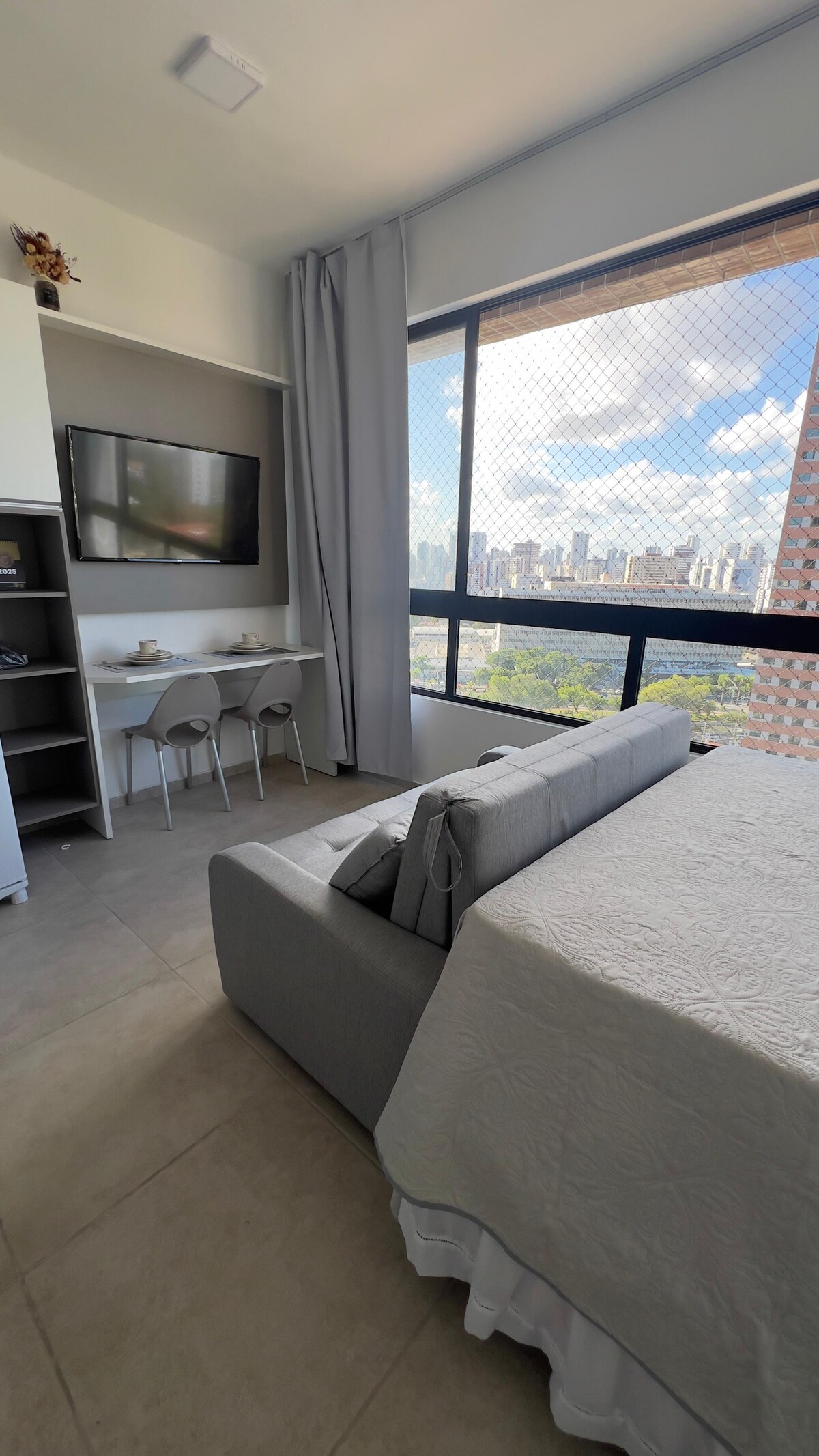 Flat na may tanawin ng dagat mula sa ika -30 palapag, pinalamutian nang maayos, may double bed, armchair para sa pagbabasa, full pantry na may refrigerator, purifier, cooktop, microwave, bodega, black - out na kurtina, perpekto para sa dalawang tao na magrelaks at mag - enjoy sa mga atraksyong panturista ng Recife o kahit na magtrabaho na may tanawin ng dagat. Ang hotel ay may restawran na may almusal, opsyonal, at hindi kasama sa halaga ng matutuluyan.
