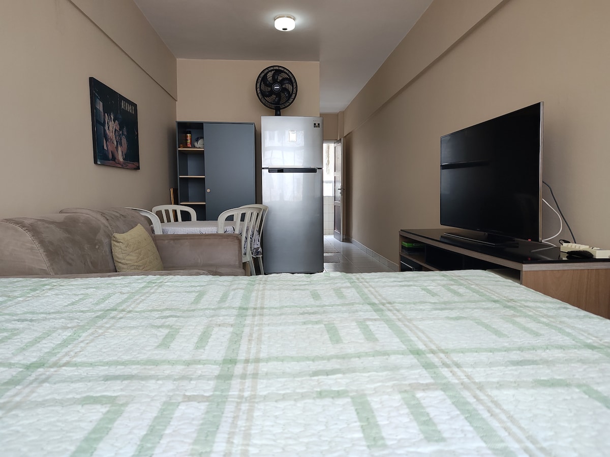 Maluwag na kitnet na may 43, 75 m2 ,komportable, at nakaharap sa dagat, na may balkonahe at napakagandang tanawin. Simple , praktikal, at nakakarelaks ang dekorasyon, para maging komportable ang bisita. Ang lokasyon ng apartment na ito ay napaka - pribilehiyo, ito ay nasa Boqueirão, sulok na may shopping center ng Praia Grande, kung saan maaari kang makahanap ng mga restawran, snack bar, parmasya , supermarket, tindahan, atbp. Ang beach ay nasa harap lamang ng gusali, tumawid lamang sa kalye at ikaw ay nasa iyong mga paa!.