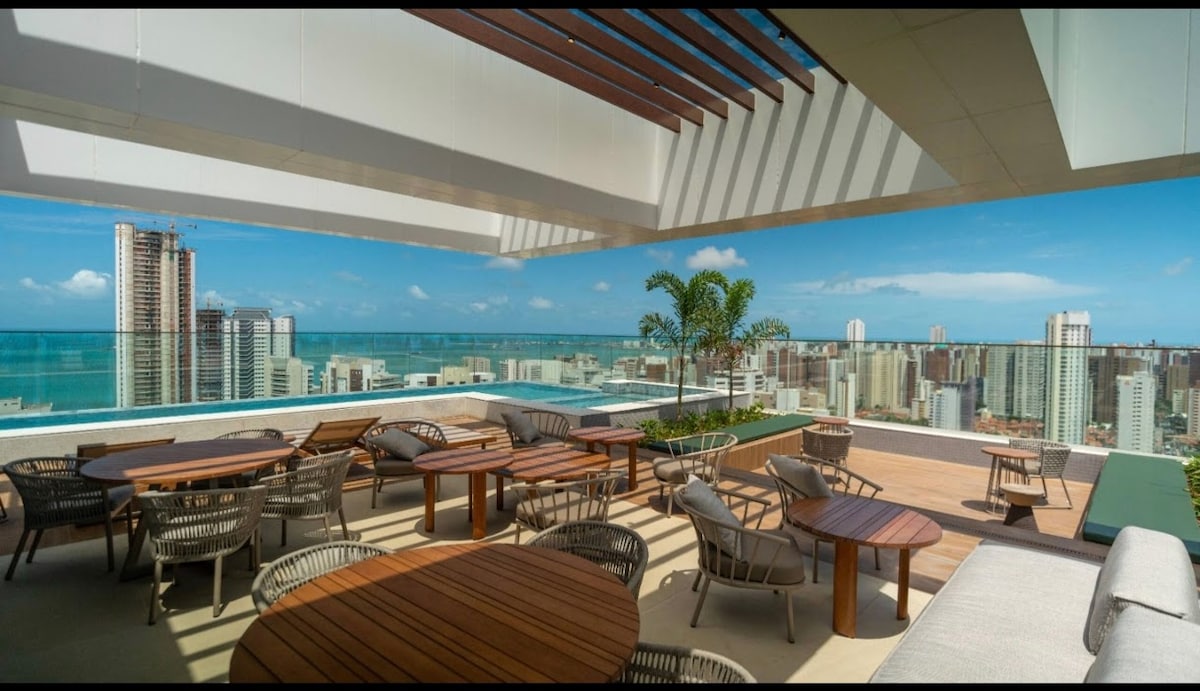Studio moderno no 21º andar com vista para o mar. A poucos passos da praia, em prédio com rooftop, piscina infinita, academia e lounge. Ideal para lazer ou trabalho, sua estadia inclui coworking completo, vaga de garagem, Wi-Fi rápido e toda a estrutura para uma experiência excepcional. Localizado no Meireles, bairro mais nobre, seguro e central de Fortaleza, esta estadia oferece conforto, praticidade e a melhor vista da cidade.
