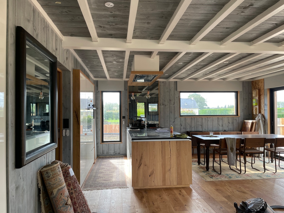Perros Guirrec Bay, sa lupaing ito sa tabing - dagat 3 Manok, 2 kabayo , 1 pusa, 1 setter nakatira nang magkasundo. Ikalulugod ni Bénédicte na tanggapin ka sa bagong bahay niya na 45 m2, tahimik at komportable, gawa sa kahoy, (ISO 2012 standard) na inayos para sa iyo. Mula sa pink granite coast hanggang sa isla ng Bréhat, magandang bisitahin ang Trégor sa loob ng 4 o 5 araw. Isang kuwarto, malaking sala, kusina, toilet at hiwalay na banyo, at terrace na may tanawin ng dagat...