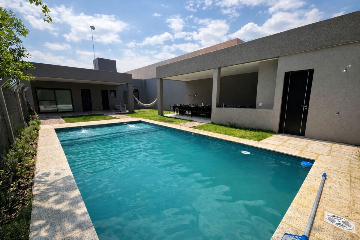 Napakahusay na bahay sa may gate na kapitbahayan, na napapalibutan ng maraming halaman, kamakailang na - remodel at na - modernize. 4 na kuwarto, ang pangunahing may en - suite na paliguan at walk - in na aparador. Full bathroom - Toilette - Living with home to wood, sala dining room and full kitchen with dining room: microwave oven - water -washels. Wifi - TV cable - Point Swimming Pool na may Humeda - Garage double covered beach - Lavarropas - Service - Barrilla - Wood - burning oven Galeria y Pergola na may sala at mesa para sa 12 - tao - Area na may kalan -