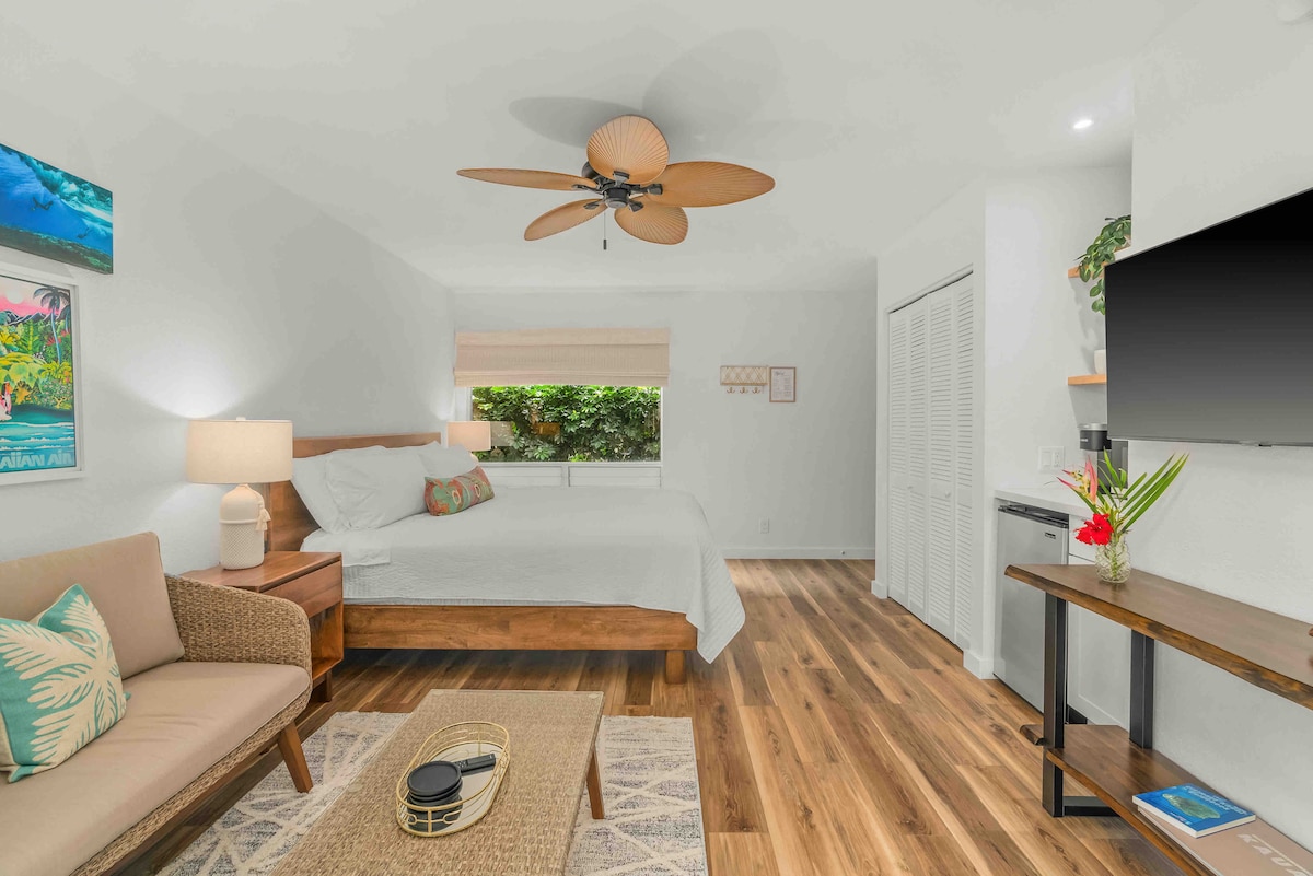 Matatagpuan ang magandang remodeled studio na ito sa luntian at romantikong North Shore ng Kaua'i. Nilagyan ng A/C, VITAMIX Blender, Heavenly king size bed, kitchenette, hot plate, 2 flat screen tv, at maaasahang wifi. Maging handa para ma - enjoy ang mga nakamamanghang tanawin at world class na hiking, snorkeling, at mga beach mula sa perpektong lokasyon sa North shore na ito. Maigsing lakad papunta sa Hideaways Beach at Queen 's Bath at maigsing biyahe papunta sa Hanalei. Ito ay higit pa sa isang bahay - bakasyunan, ito ay paraiso!