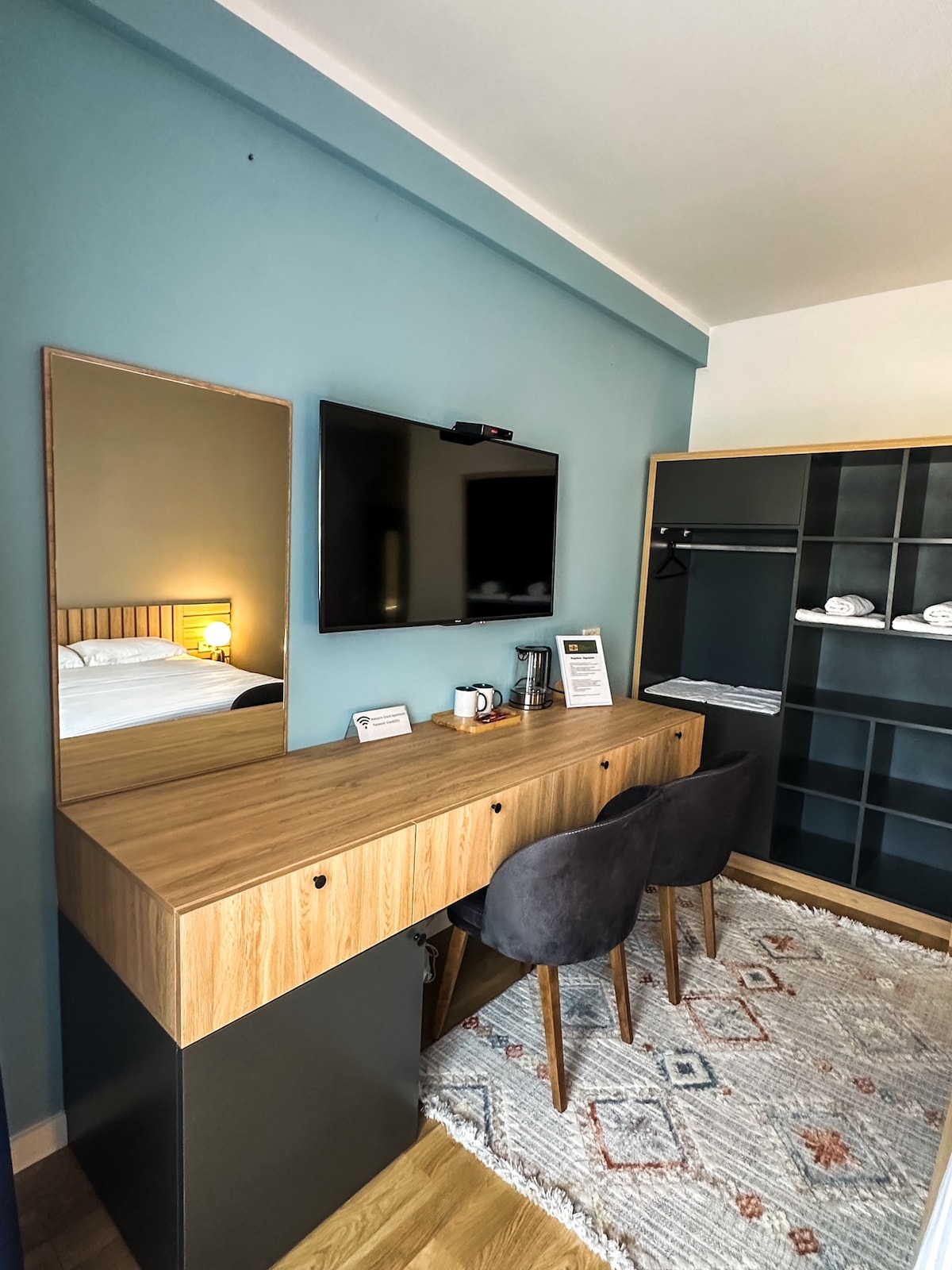Mga Komportableng Tuluyan: Nag - aalok ang Nuvelle Boutique Hotel sa Prizren ng mga kuwartong may air conditioning na may mga pribadong banyo, tsaa at coffee maker, at libreng toiletry. Kasama sa bawat kuwarto ang hapag - kainan, work desk, TV, at aparador. Mga Modernong Amenidad: Masisiyahan ang mga bisita sa mga tanawin ng bundok at lungsod, libreng paradahan sa lugar, at kapaligiran na mainam para sa alagang hayop. Kasama sa mga karagdagang amenidad ang hairdryer, electric kettle, at tsinelas.