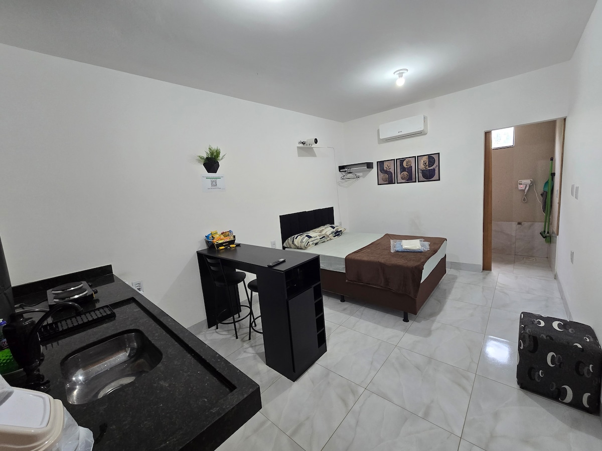 You will feel at home in this newly renovated studio apartment, designed with attention to every detail. Located in the Real Grandeza neighborhood, we are strategically positioned very close to the Aparecida de Goiânia Industrial Center, making it the perfect choice for business travelers or couples seeking comfort and convenience.
