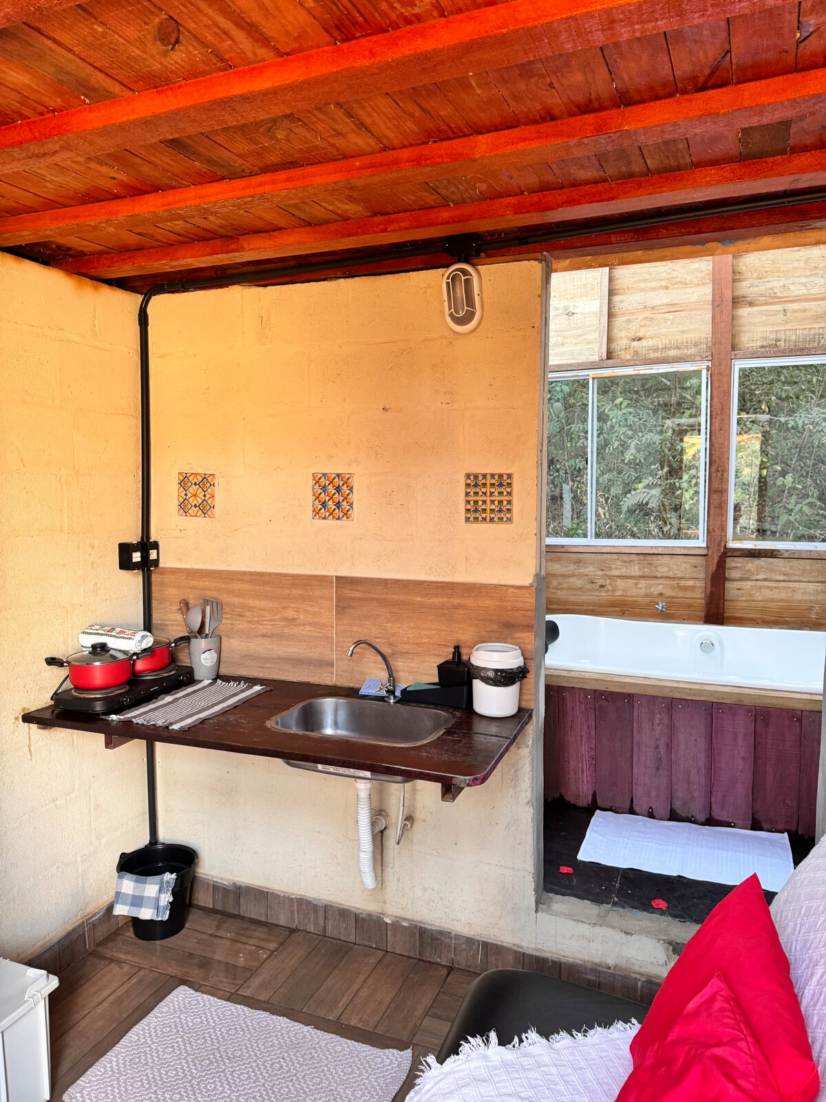 Cabana da Floresta — onde o pôr do sol encontra o lago. Com um deck exclusivo de frente para o lago, é o cenário ideal para admirar o pôr do sol. Equipada com duas banheiras de imersão, cozinha completa, sala com sofá-cama e um quarto separado com cama queen com janela voltada ao bosque, oferece conforto, privacidade e uma experiência inesquecível em meio à natureza. ❌ Não são permitidos eventos. ✔️ Regras detalhadas nas informações específicas na aba "Regras da Casa", leia atentamente.