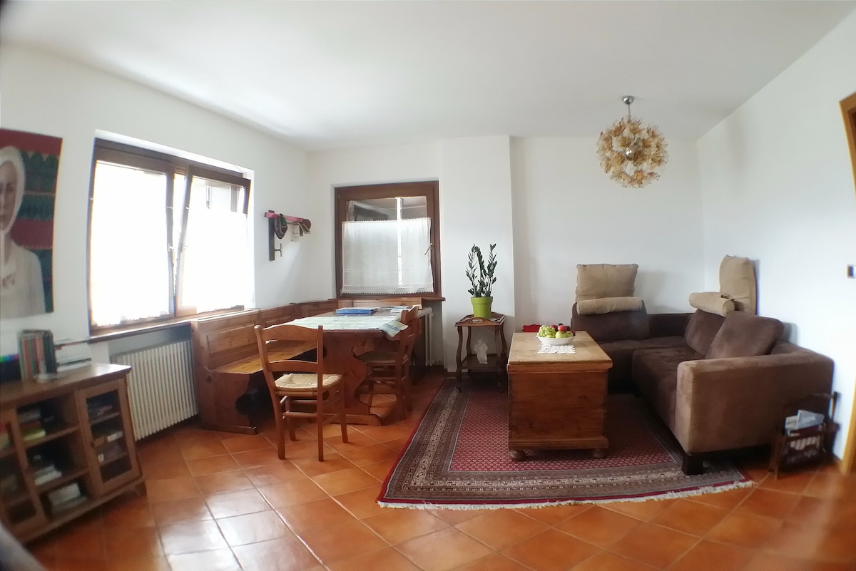 Three-room attic apartment of 50 m2 with balcony overlooking the mountains, consisting of: living room with fully equipped kitchen, 2 double or twin bedrooms with possibility to add a single bed in the main, bathroom with shower, bed linen and towels included. Possibility to include breakfast or half board in the apartment.