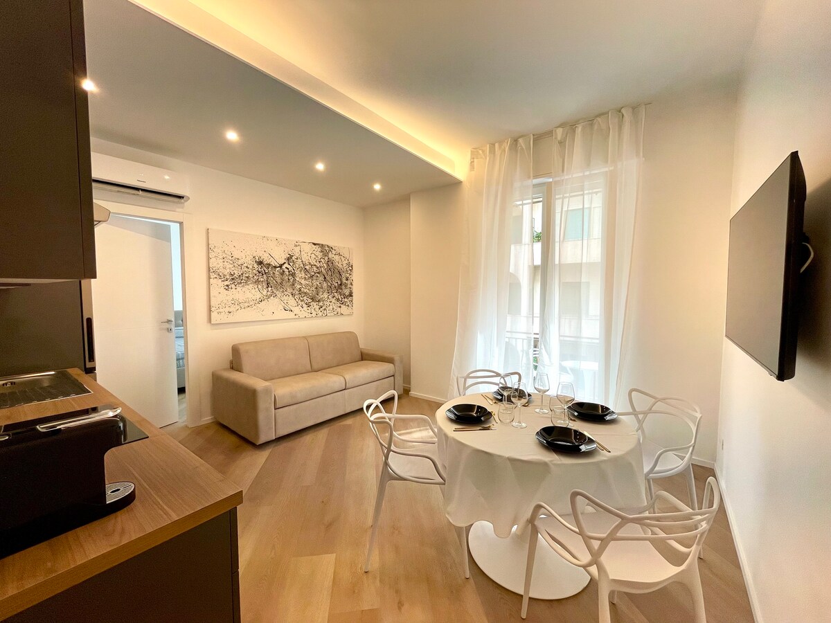 Appartamento in posizione centralissima e strategica che permette di raggiungere il centro cittadino, la pista ciclabile, il Porto turistico, la stazione e le spiagge in pochissimi minuti a piedi. L'alloggio è stato completamente ristrutturato ed arredato a nuovo ed è composto da ingresso, zona living con angolo cottura e divano letto, camera matrimoniale, bagno con doccia, piccolo ripostiglio, balcone con parziale vista sul mare.