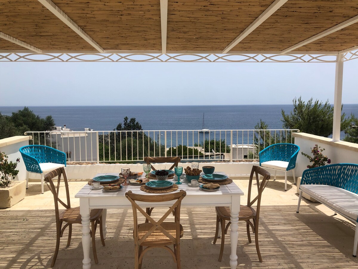 Vintage Salento apartment, kamakailang na - renovate na may mahusay na lasa at lahat ng kaginhawaan. Magagamit na espasyo sa labas at hindi mabibiling pagbaba sa pribadong dagat na gumagawa ng banyo sa mga coves at natural na paliguan na inukit sa mga bato na eksklusibo at nag - iisa, kahit na sa mga pinakamainit na araw ng tag - init! Bahagi ang apartment ng complex kung saan matatanaw ang dagat na may malaking hardin ng condominium, nakareserbang espasyo kung saan puwede kang kumain sa ilalim ng mga bituin at matatanaw ang dagat at gamitin ang barbecue