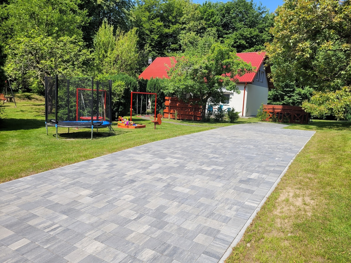 Isang atmospheric holiday home sa isang intimate area, na may access sa Lake sa pamamagitan ng isang pribadong kalsada (ilang dosenang metro) * Perpektong lokasyon: malayo sa pagmamadali at pagmamadali at mga turista, * Ang karagdagang libreng kagamitan ng cottage ay isang kayak, 2 bisikleta, * Perpekto para sa mga mag - asawa, pamilya na may mga anak o isang grupo ng mga kaibigan. Malapit sa: * Yate port, pag - upa ng kagamitan sa tubig, *Restawran, *Forest, * Valley of Kashubian Palaces, * Recreational at Olympic swimming pool, gym, SPA, bowling, * Madaling access sa dagat
