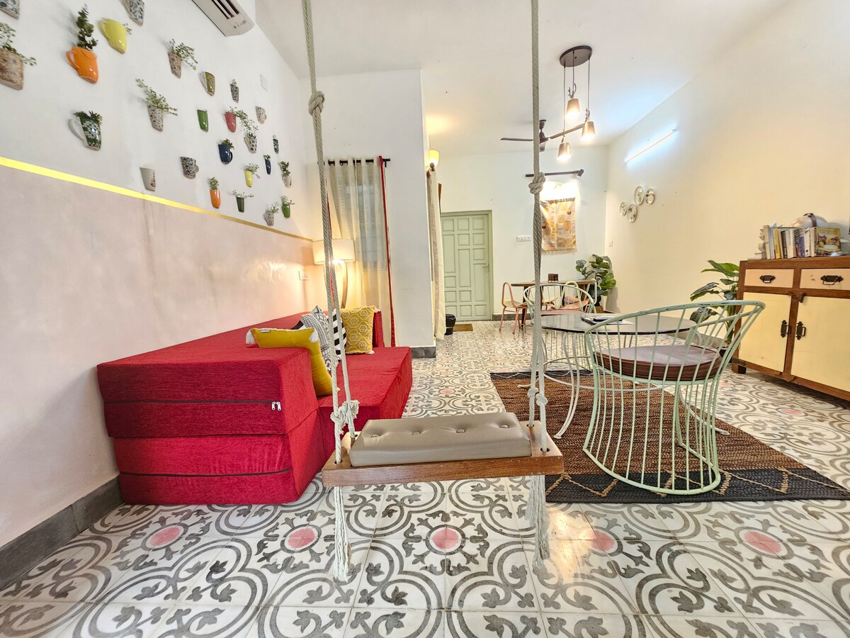 Pinalamutian nang mabuti ang iyong tuluyan sa Auroville sa tema ng Chettinad. Instagramworthy ang bawat sulok ng aming tuluyan na may makukulay na interior, kolam art, antigong dekorasyon, at marami pang iba. Ang 1BHK ay maaaring kumportableng tumanggap ng hanggang sa 4 na tao na may swing bed at sofa bed sa living room. hile mayroong maraming mga restaurant sa malapit, ang aming kusina ay maingat na nilagyan para sa lahat ng iyong mga pangangailangan - maging ito upang gumawa ng isang mabilis na omelette o isang buong Indian na pagkain. Kaya umupo, magrelaks at humigop ng iyong kape.
