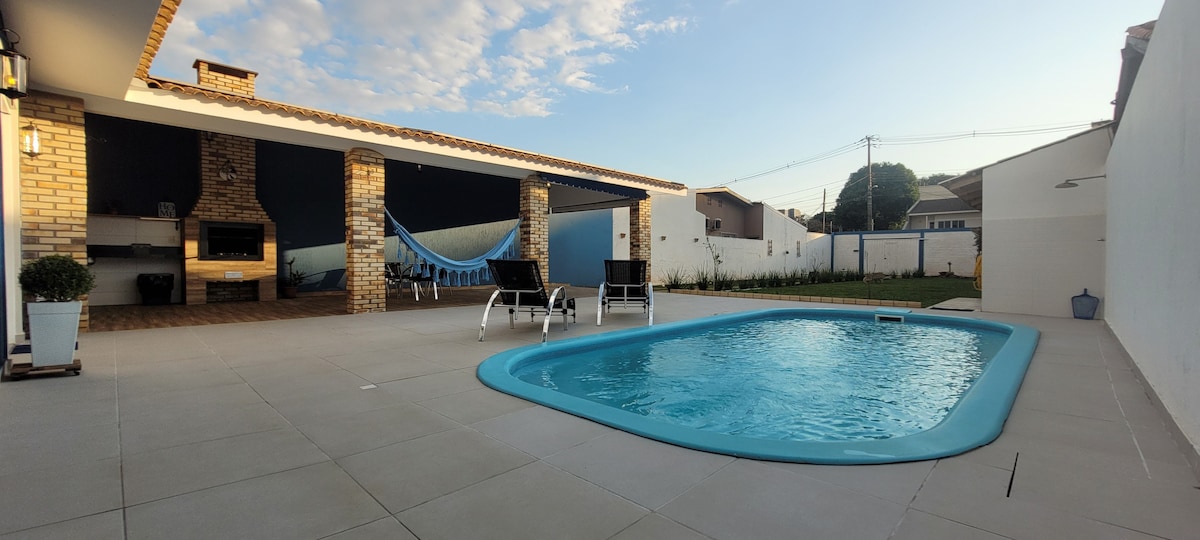 Ang aming bahay sa Foz do Iguaçu, sa Land of the Falls, ay isang lugar para magpahinga, ngumiti at lumikha ng magagandang alaala. Idinisenyo para sa mga pamilya at grupo, kayang tumanggap ito ng hanggang 13 bisita, na may 4 na kuwarto, 4 na banyo, at airâcondition sa lahat ng kuwarto. Masaya sa 2 pool, barbecue area, pool table, pingâpong table, at sa espasyo ng mga bata. Dito, malugod na tinatanggap ang iyong alagang hayop. May garahe para sa 4 na sasakyan at labahan para mas kumportable.