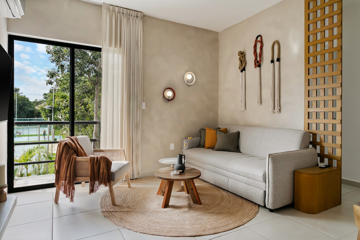 Mamalagi sa bagong 2Br/2BA condo sa loob ng ligtas na komunidad na may gate, 8 minuto lang ang layo mula sa beach. Masiyahan sa mga amenidad na may estilo ng resort kabilang ang mga pool, gym, tennis, pickleball, at firepit. Napapalibutan ng mga maaliwalas na tanawin ng kagubatan at eleganteng halaman, pinagsasama ng tahimik na bakasyunang ito ang modernong kaginhawaan at tunay na kagandahan ng Mexico. Matatagpuan sa pagitan ng Cancun at Playa del Carmen, ang tahimik na bakasyunang ito ay nag - aalok ng perpektong base para matikman ang tunay na lokal na lutuin at magbabad sa nakakarelaks na kagandahan ng maganda at mapayapang bayan na ito.