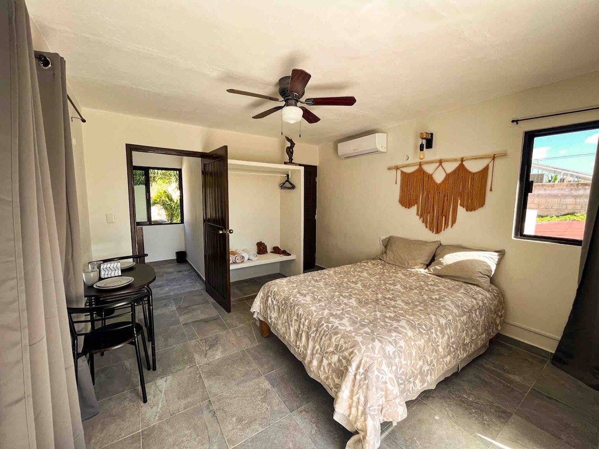 Pribadong studio para sa mga nakakaalam ng ilog at naghahanap ng magandang lugar na matutuluyan. Mainam para sa mga mag - asawa, grupo ng 3 o pamilya na may 4 na tao. Puwede kang maglakad papunta sa mga kalapit na lugar tulad ng mga ahensya, sobrang pamilihan, tindahan, restawran, bar, coffee shop, at beach. - Access sa beach sa Av. Colosio, 550 m (8 minuto) - Access sa Playa sa 48th Street, 800 m (10 min.) Convenience store oxxo, 400m (5 min.) - Quinta Avenida, 350m (5 minuto) - Super Mercado Chedraui Selecto, 800m (12 min)
