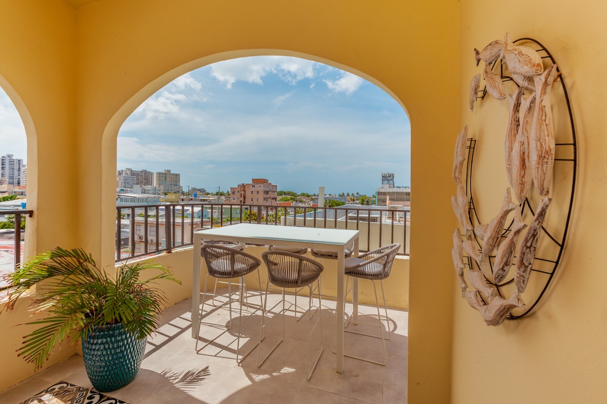Maghanda nang i-enjoy ang pinakamagaganda sa San Juan sa magandang penthouse na ito na nasa ikaapat na palapag ng kaakit‑akit na gusaling kolonyal sa Santurce. 8 minutong lakad lang papunta sa Ocean Park Beach at ilang hakbang lang mula sa Loíza Street, isang masiglang lugar na puno ng mga restawran, bar, at lokal na kultura. Ang pinakamagandang tampok ng property ay ang nakapalibot na terrace nito, na perpekto para sa kape sa umaga o barbecue sa paglubog ng araw. May libreng pribadong paradahan isang bloke ang layo at kailangang hilingin sa pagbu‑book, depende sa availability.