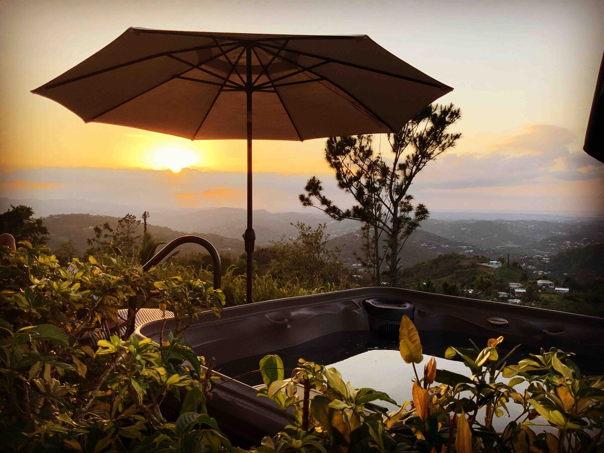 Pagrerelaks sa tuluyan sa bansa na may malalaking kalangitan at komportableng higaan. Naghahanap ng isang pribadong taguan kung saan wala kang magagawa kundi magrelaks, muling balansehin at palitan ang iyong sarili. 30 minuto lang mula sa SJU airport. Masiyahan sa aming jacuzzi na may hydrotherapy massage habang tinitingnan ang aming mga nakamamanghang tanawin ng bundok, lungsod at karagatan. Idinisenyo ang bahay na ito para maging home away from home. Perpekto para sa mga kaganapan at maliliit na kasal, may karagdagang bayarin na malalapat. Tandaan - Idinagdag ang AC noong Marso 2025 / Buong Power Generator