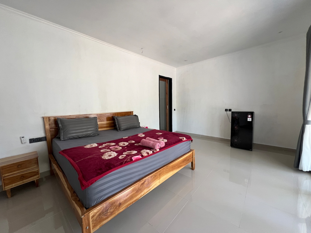 Komportableng homestay na may pribadong kusina at banyo, 5 minuto lang ang layo ng scooter mula sa sentro ng Kuta. Kasama sa kuwarto ang king - size na higaan, air conditioning, desk na may Wi - Fi na perpekto para sa malayuang trabaho, at lugar para mag - hang ng mga damit. Nilagyan ang kusina para sa paghahanda ng magaan na pagkain at nagtatampok ito ng refrigerator, cooking plate, water kettle, at inuming tubig. May hot water shower sa pribadong banyo. Nag - aalok din kami ng matutuluyang scooter at transportasyon.