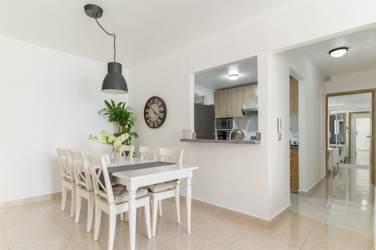 Ang bagong apartment na ito ay ang perpektong pamamalagi para sa isang pamilya at mga kaibigan na bakasyon. Matatagpuan ito 10 minuto mula sa Paliparan ng Santiago, na puno ng mga amenidad, at kumpleto ang kagamitan. May 3.5 banyo, 3 silid - tulugan na may A/C at silid - tulugan ng bisita na may twin bed, bentilador at sariling banyo. kumpletong kusina, Dalawang sala,A/C, Dalawang 50" Smart TV, Bluetooth Speakers at dalawang paradahan. Masisiyahan ka rin sa paligid ng complex tulad ng, palaruan, pool, event room, lawa, at sport court.