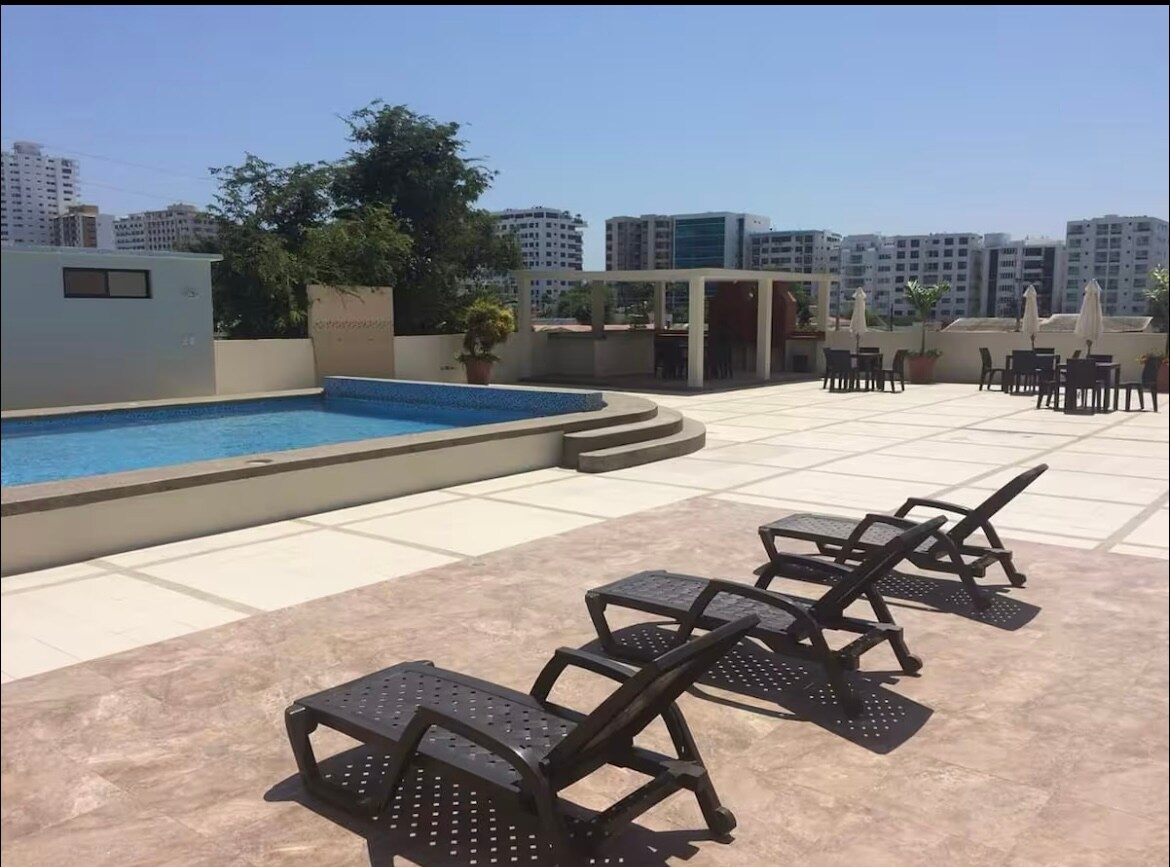 Elegant Suite sa likod ng Barceló Hotel, 150 metro mula sa Sea, residential area, 100 metro mula sa prestihiyosong Salinas food court, ay may mahusay na tanawin at maraming lugar upang tamasahin ang isang nakakarelaks at ligtas na maginhawang kapaligiran. Mayroon itong pool, jacuzzi, gym, at sosyal na kuwarto.