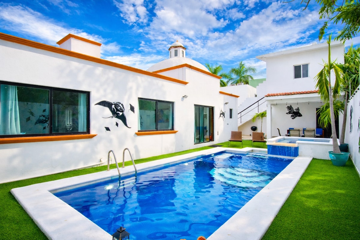 I - enjoy ang villa na ito na may magandang tanawin ng karagatan, ang mga Villa Marlin ay matatagpuan sa isang tahimik na lugar sa likod mismo ng eksklusibong kukulkan Plaza shopping center. Magrelaks sa ilalim ng araw sa isa sa mga pool o bumaba sa mga beach na may puting buhangin. Ang complex ay may 3 magagandang pool (kabilang ang kids pool), tennis court, at 24 na oras na seguridad na may pribado at kontroladong pasukan