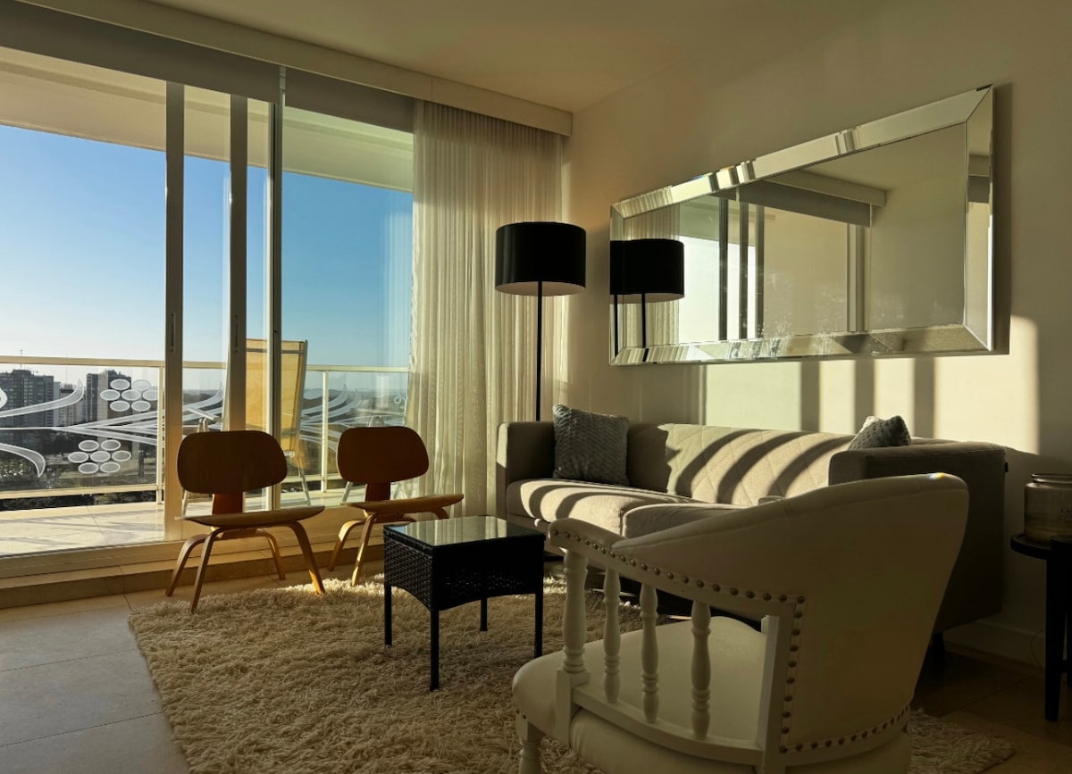 Monoambiente sa Torre ng mahusay na kategorya, mga hakbang mula sa tip sa pamimili at ilang bloke mula sa beach. Talagang komportable at gumagana, kumpleto ang kagamitan, mataas na palapag, tanawin sa Isla de gorriti at playa mansa. A/C, serbisyong pang - araw - araw na kasambahay at porter 24 na oras Ibinibigay ang sabon, toilet paper, tuwalya at mga sapin. TV na may Directv. High - speed na wifi