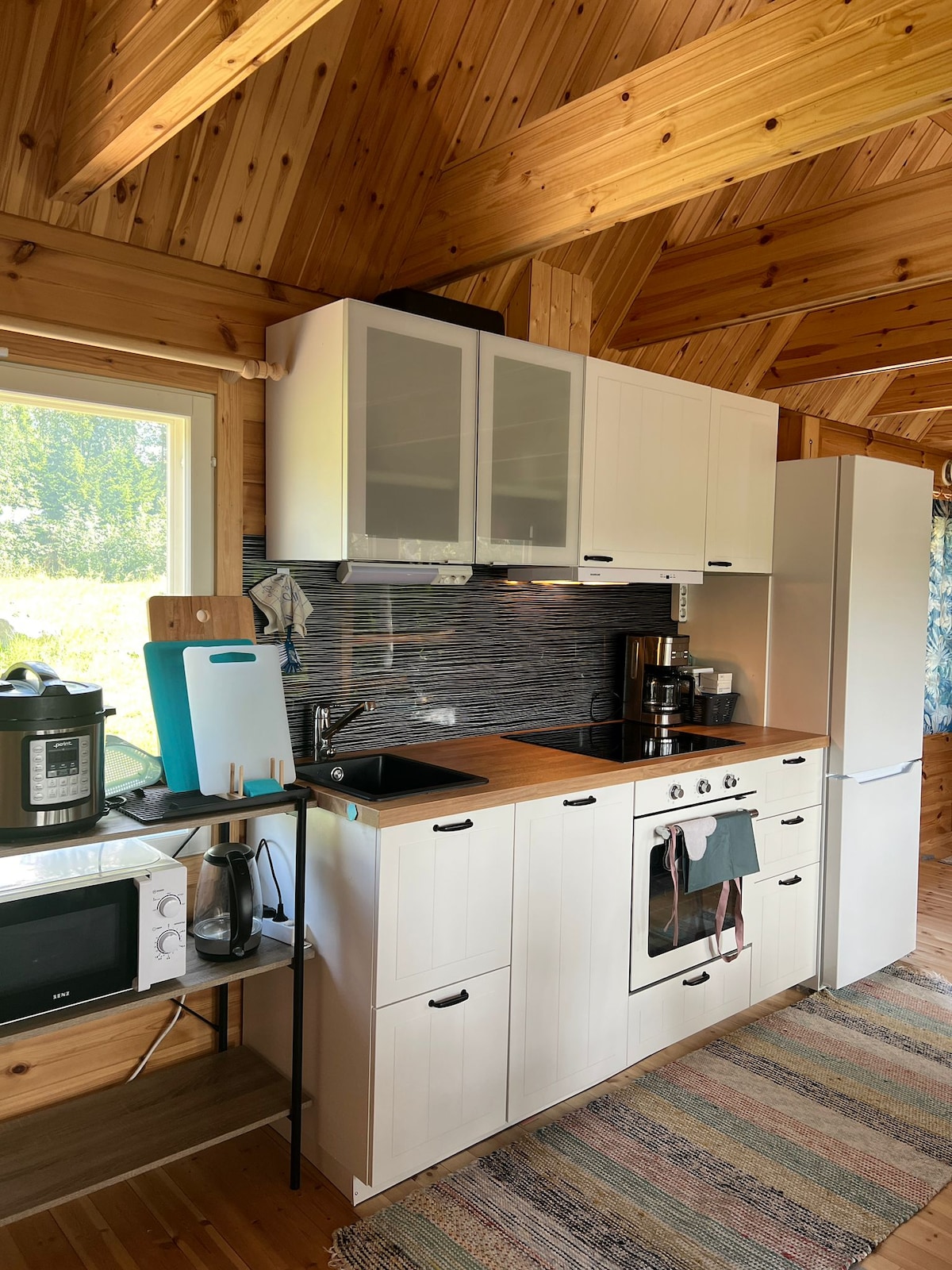 Isang maginhawang cottage na natapos noong 2019, kung saan maaaring maging komportable ang 6 na tao habang nasisiyahan sa magandang tanawin ng lawa. Ang isang kuwarto ay may double bed (160 cm), ang isa pa ay may 2 double bed (140 cm) na naka-stack. May shower at toilet sa bahay. May maliit na canopy, gas grill at dining table sa beach terrace. Mayroong hot tub at terrace na may magandang view ng sunset sa tabi ng barrel sauna. Mababaw ang beach at angkop din para sa mga bata. Ang lote ay tahimik at protektado ng mga puno mula sa mga kapitbahay. Walang mga alagang hayop.