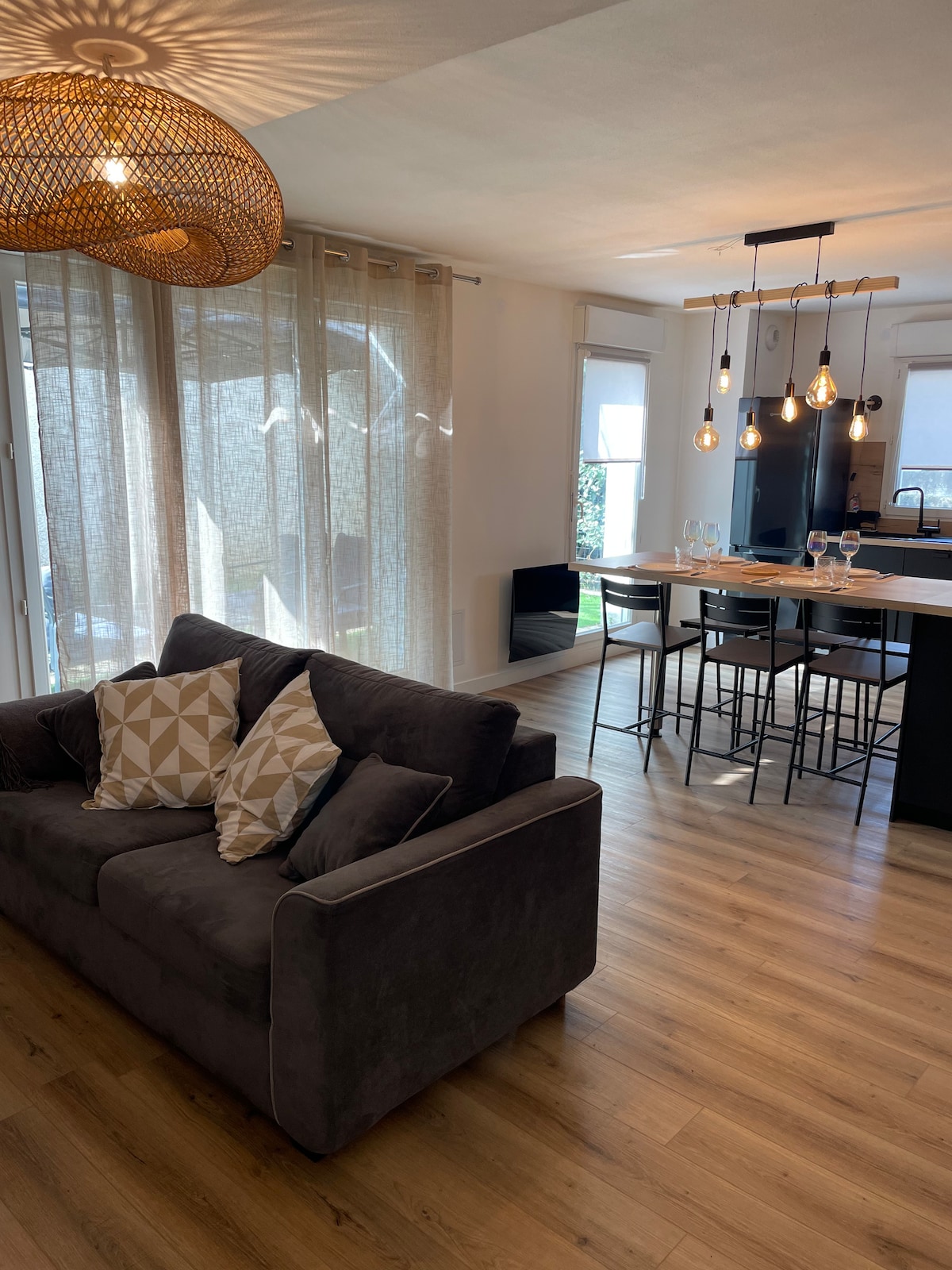 Tuluyan para sa isang malaking pamilya o mga kaibigan at iyong mga alagang hayop din. Ganap na na - renovate na bahay na tumatanggap ng hanggang 10 tao. Nag - aalok kami sa iyo sa unang palapag ng 1 kusina na kumpleto sa kagamitan, 1 mainit na sala na may 1 sofa bed, 1 shower room na may 1 toilet at 1 silid - tulugan na may 1 kama 160X200. Sa itaas ng 1 shower room na may 1 WC, 2 silid - tulugan na may 1 higaan 160x200 at 1 90x190 na higaan sa bawat silid - tulugan. Puwede kang magparada ng 3 kotse o higit pa kung kinakailangan sa harap ng bahay