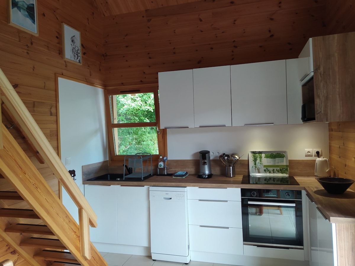 Naka‑renovate na apartment na 28 m2 sa unang palapag ng bahay namin na may spiral staircase. 18 m² na terrace na nakaharap sa timog, walang harang na tanawin ng kabundukan. Tahimik na kapitbahayan. 1 kuwartong may kumpletong munting kusina, sala na may TV, wifi, at sofa bed, 1 silid - tulugan na may double bed (140 x 190 cm) at dalawang bunk bed (90 x 190 cm). 1 banyo na may shower at toilet. Tamang-tamang tuluyan para sa 2, hanggang 4 na tao ang pinakamarami. Paradahan sa pribadong paradahan. 900 metro ang layo sa sentro ng lungsod at istasyon ng tren.