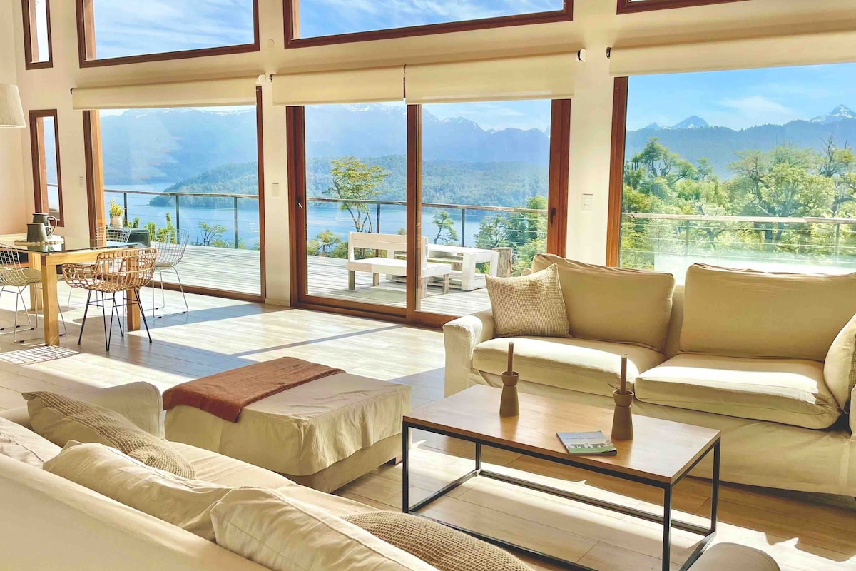 Casa en Villa La Angostura con espectacular vista al lago en barrio Bandurrias. El río correntoso está a 1.9km caminando, el Nahuel Huapi a 2.1km el Espejo Chico a 5km por el sendero del camino viejo. Tiene 3 dormitorios, dos baños completos más toilette de recepción. Cocina súper equipada. WIFI y cable por fibra óptica. Smart TV. Generador eléctrico. Parrilla y fogonero. Calefacción losa radiante. Aires acondicionados y hogar a leña. Inmenso deck con vista al lago y mobiliario de exterior.
