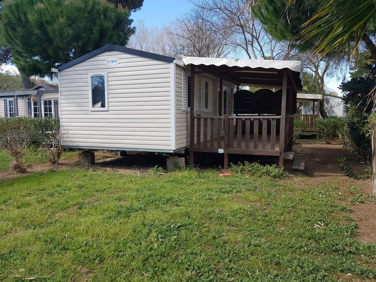 Bungalow na katabi ng caravan, 6 na lugar sa tahimik na campsite ng pamilya na 1 km ang layo mula sa nayon ng Saint - Nazaire ( iba 't ibang tindahan). Dagat 4 km papunta sa Canet en Roussillon, masiglang lungsod sa tag - init. Mga 30 km ang layo ng Pyrenees, Perthus, Spain. Kagamitan: electric coffee maker, microwave, washing machine, dishwasher, refrigerator na may freezer, apat na fire gas stove, oven, electric kettle, TV, electric barbecue. Mahalaga: dapat gawin ang pag - upa nang 7 gabi mula Sabado hanggang Sabado.