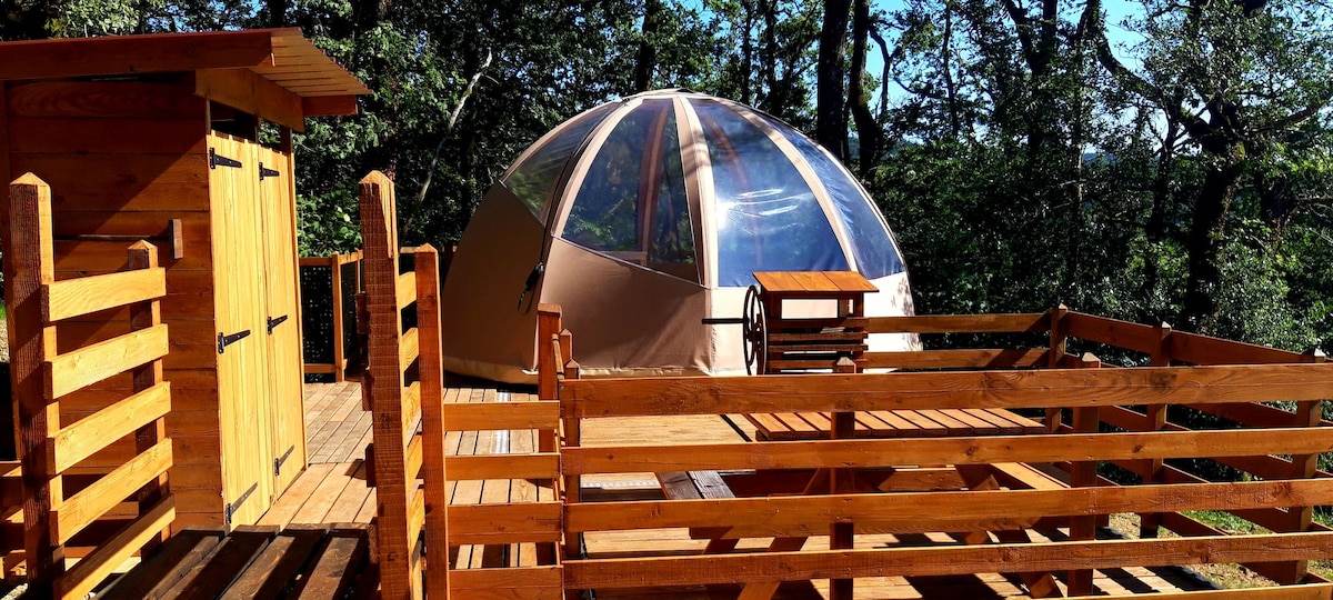 Karaniwan lang ang bubble na ito!!! Nakamamanghang tanawin ng lambak na may kahanga - hangang paglubog ng araw at sa gabi maaari mong hangaan ang mabituin na kalangitan nang komportable mula sa iyong higaan o sa kahanga - hangang kahoy na terrace. Ang dome ay maaaring lumipat salamat sa isang crank, upang pumasa sa loob ng ilang segundo mula sa lilim hanggang sa liwanag!!! Na - maximize namin ang diwa ng ekolohiya gamit ang mga dry toilet at lantern lighting. Posibilidad na mag - recharge ng laptop