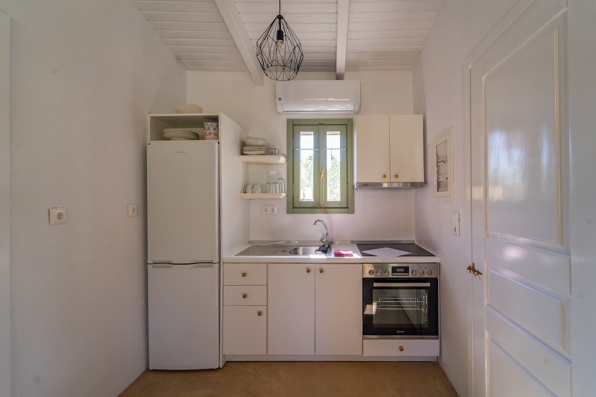 Isang komportableng studio na may estilo ng boutique na mainam para sa matatagal na pamamalagi sa isla; may port, bus stop, beach, restawran at tindahan na ilang minuto lang ang layo! Magrelaks, punan ang iyong mga baterya at tamasahin ang perpektong balanse sa pagitan ng komportableng modernong setting at tunay at tradisyonal na hospitalidad ng aming tuluyan! Ang bahay ay maaaring tumanggap ng mahigpit na dalawang tao