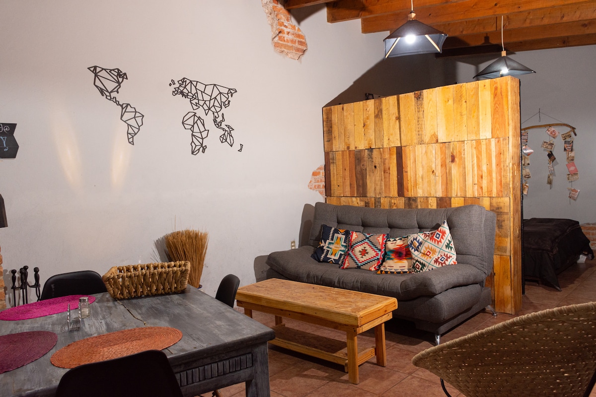 Beautiful suite Boutique concept furnished with antique touch but fully equipped. Heart of the historic center. Beautiful apartment located on pedestrian street in the best location in downtown w/ amazing private rooftop terrace. The apartment sleeps 2 people is fully equipped with private bathroom, kitchen and dining area. Walking distance to everywhere in downtown Queretaro. The place is clean quiet and full of design. Nice terrace Safe box Bathroom Queen size bed Dining room Living room 49