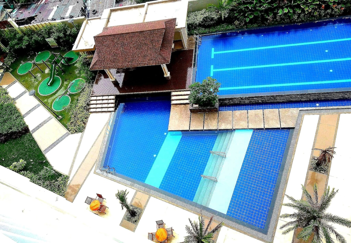 Perpekto ang patuluyan ko para sa bakasyon ng pamilya o Barkada (Grupo ng mga Kaibigan). Masisiyahan ka sa mga Olympic size na swimming pool. Ang transportasyon ay napakadali na may 24/7 na access sa paligid ng vicinity at ito ay malapit sa % {bold Aveend} Station. Bukod pa rito, walang dapat alalahanin kapag nagugutom ka sa kalagitnaan ng gabi, maraming 24/7 na maginhawang tindahan sa paligid ng lugar. Hindi masyadong mahal ang mga presyo. Laging available ang Barangay Tanods/Police sa loob ng Timog at Mother Ignacia.