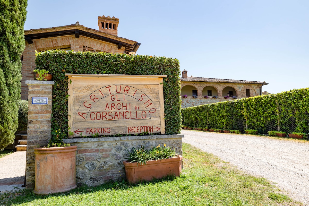 Ang Caggiolo ay isang ganap na na - renovate na bukid na binubuo ng ilang apartment, ang bawat isa ay may pribadong pasukan at eksklusibong paggamit ng hardin, na may malawak na tanawin ng Siena. Matatagpuan 1 km mula sa Ville di Corsano, 14 km lang mula sa lungsod. Mainam na lugar para magpahinga nang ilang araw at mag - enjoy sa mga kababalaghan na iniaalok ng lugar na ito (Chianti, Val d 'Orcia, Crete Senesi..). Mula sa bukid, puwede kang mag - hike papunta sa Kastilyo ng Grotti ( 6 km) o papunta sa aming lawa (2.5 km)