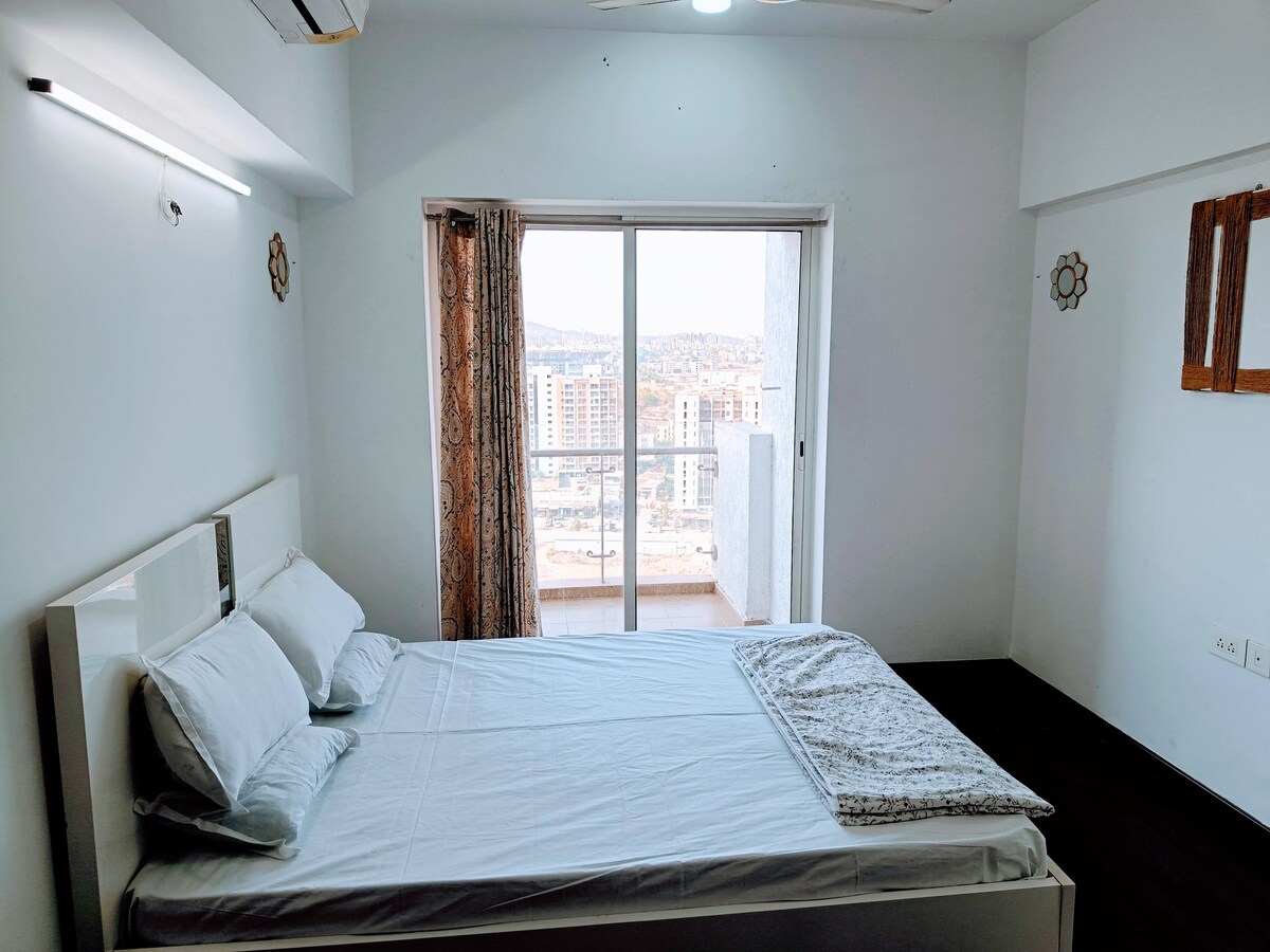 Nest ( 1BHK AC Suite) 32nd Floor splendid view of Pune City. #Living Area: Airconditioned 56incs Smart 4KHD TV Alexa ECO music 🎶 experience Books,Cards and Ludo Queen size sofa cum bed Dinning/Work Table with Chairs Broadband internet connectivity. Balcony #Kitchenette: Microwave Oven Induction Plate Hot Kettle 🔥 Toaster French Press Cookwares Crockeries Coffee Mugs Complementaries #Bedroom Room Airconditioned Queen size bed with side tables Dressing Mirror Wardrobe Balcony