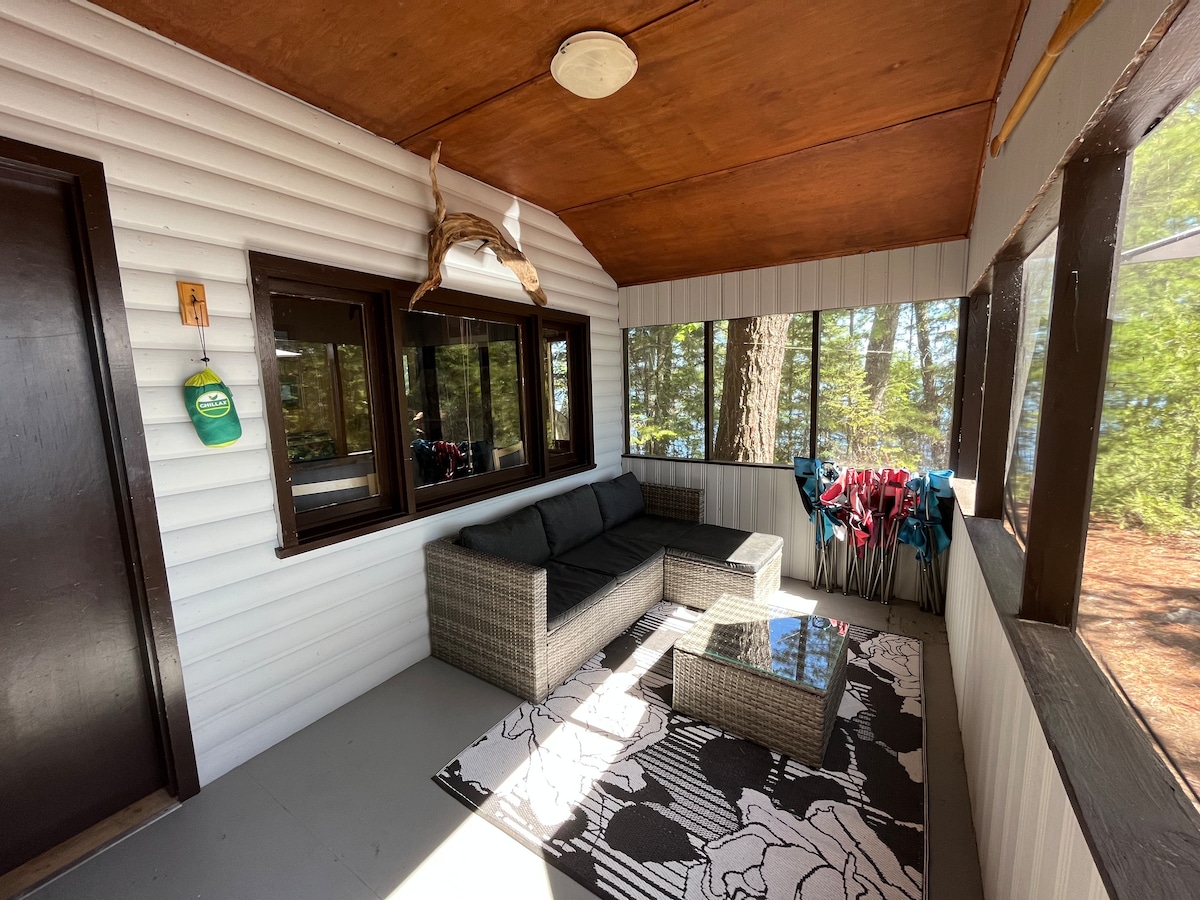 Tanawin ng tubig mula sa iyong naka - screen sa beranda - walang lamok. Ganap na kapayapaan at katahimikan. Walang ingay sa kalsada o mga ilaw sa kalye. Pangingisda para sa Walleyes, Northern Pike, Bass, at Crappies. 12 minutong biyahe lang ang layo ng mahusay na pangingisda para sa Lake Trout. Libre ang aming paglulunsad ng bangka. Libre ang mga dock na may kuryente para singilin ang iyong mga baterya ng bangka. Available ang mga rental boat. Makatipid ng karagdagang 10% kung magpapaupa ka nang isang linggo.