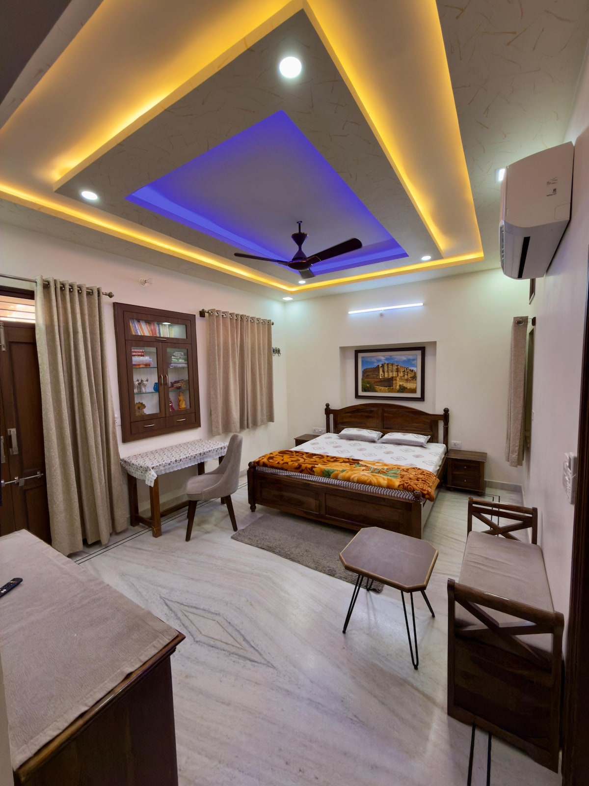 Maglalakad papunta sa pinakamadalas mangyari na lugar sa Jaipur, WTP at Gaurav Tower. Matatagpuan 3.5 km lang ang layo mula sa Jaipur Airport na may hiwalay na pasukan, pribadong banyo, refrigerator/toaster/kettle, na may workspace, balkonahe, at air conditioning. May sahig na gawa sa kahoy ang kuwarto para makapagbigay ng init at kaginhawaan. Pinapanatili naming naka - sanitize ang kuwarto para sa iyong kaligtasan. Maraming kumakain ng mga kasukasuan sa malapit ang nagbibigay ng tanghalian at hapunan. Nagsisikap kaming magbigay ng iniangkop na pangangalaga at mainit na hospitalidad nang hindi ginagambala ang iyong privacy.