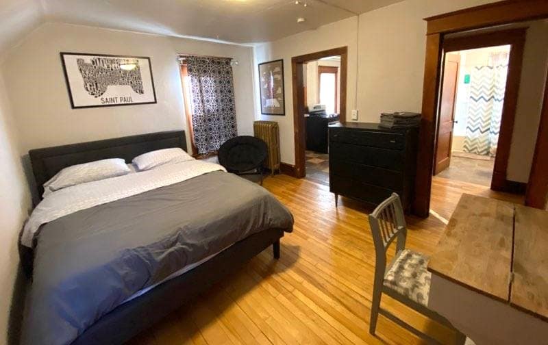 This charming Saint Paul suite is located on the third floor of a duplex with a private entry. Comfort and privacy await in your king bed suite! The unit has very easy access to both downtowns and is also within a 15 minute walk to the light rail! The space is perfect for those traveling to the Twin Cities looking for a traditional St. Paul experience in a relaxed spot that is completely your own. Also perfect for families visiting students at nearby colleges in St. Paul!