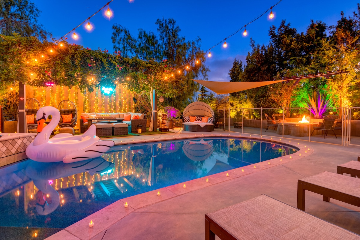 Brand New Property! Napakalaking hardin ng Eden style resort home na may malawak na panlabas na entertainment area at maluwag na bukas na konsepto sa loob, perpekto para sa mga malalaking pamilya na may mga bata at responsableng matatanda. Na - update sa itaas hanggang sa ibaba kasama ang lahat ng bagong panlabas at panloob na muwebles, modernong upgrade sa lahat ng kuwarto at common area. May gitnang kinalalagyan at 20 minuto mula sa beach at lahat ng nangungunang atraksyon ng SD! 8 taong hot tub, sparkling gas heated saltwater pool at bagong panlabas na kusina. Huwag palampasin!